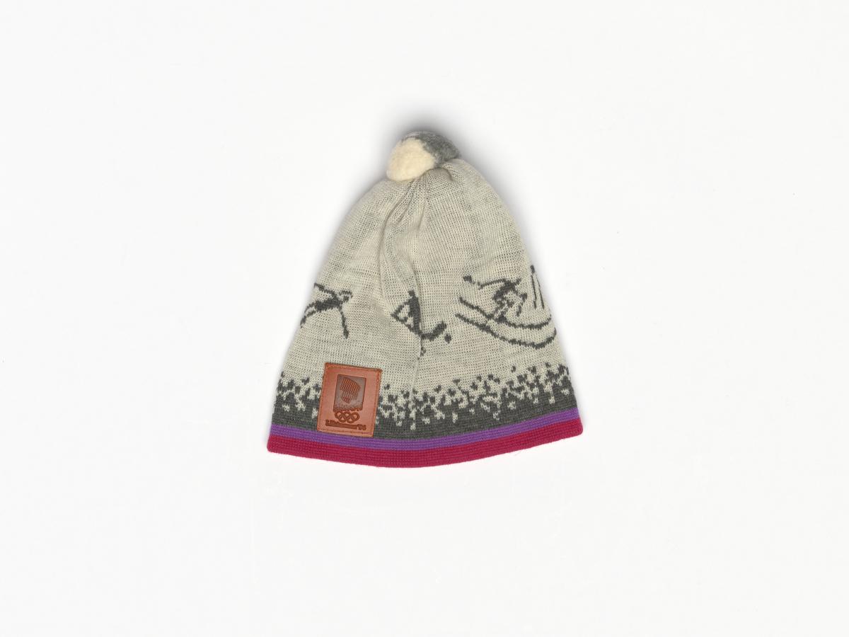 Grey bonnet with a purple edging, the pictograms of the sports and a patch with the emblem of the Games.