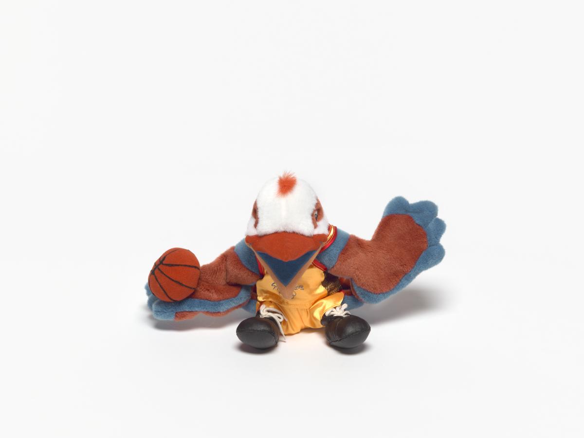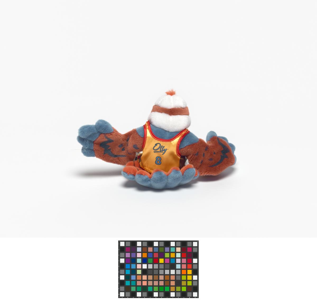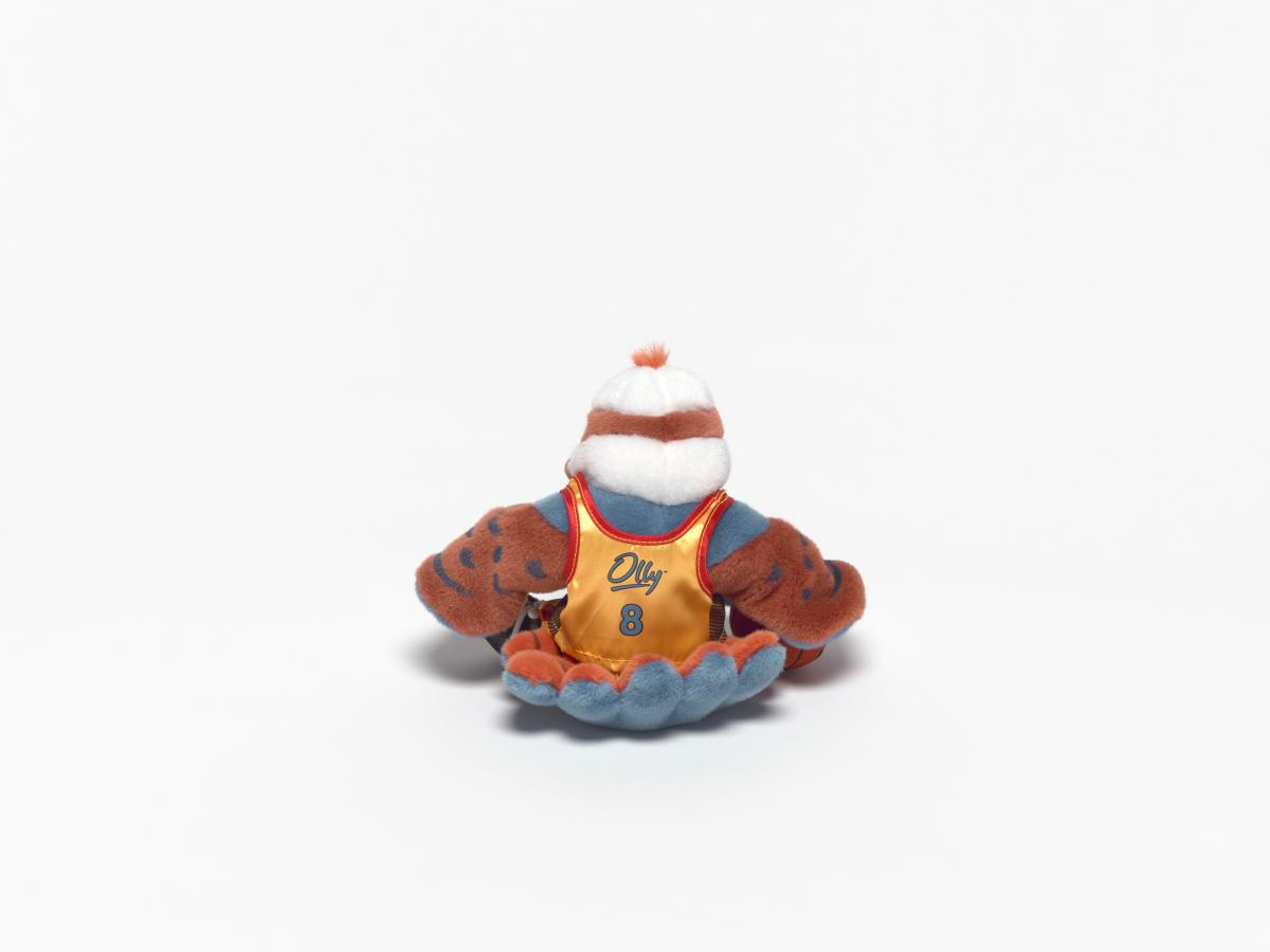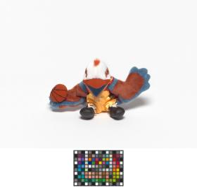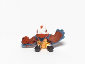 Kingfisher shape stuffed toy. Its wearing an orange basketball suit.