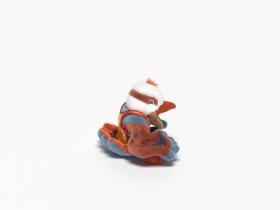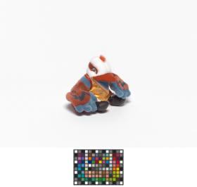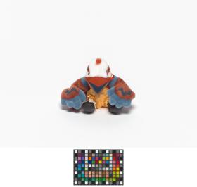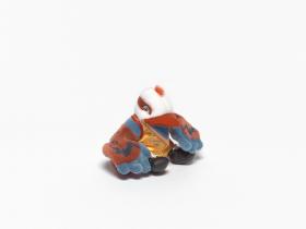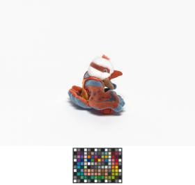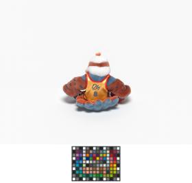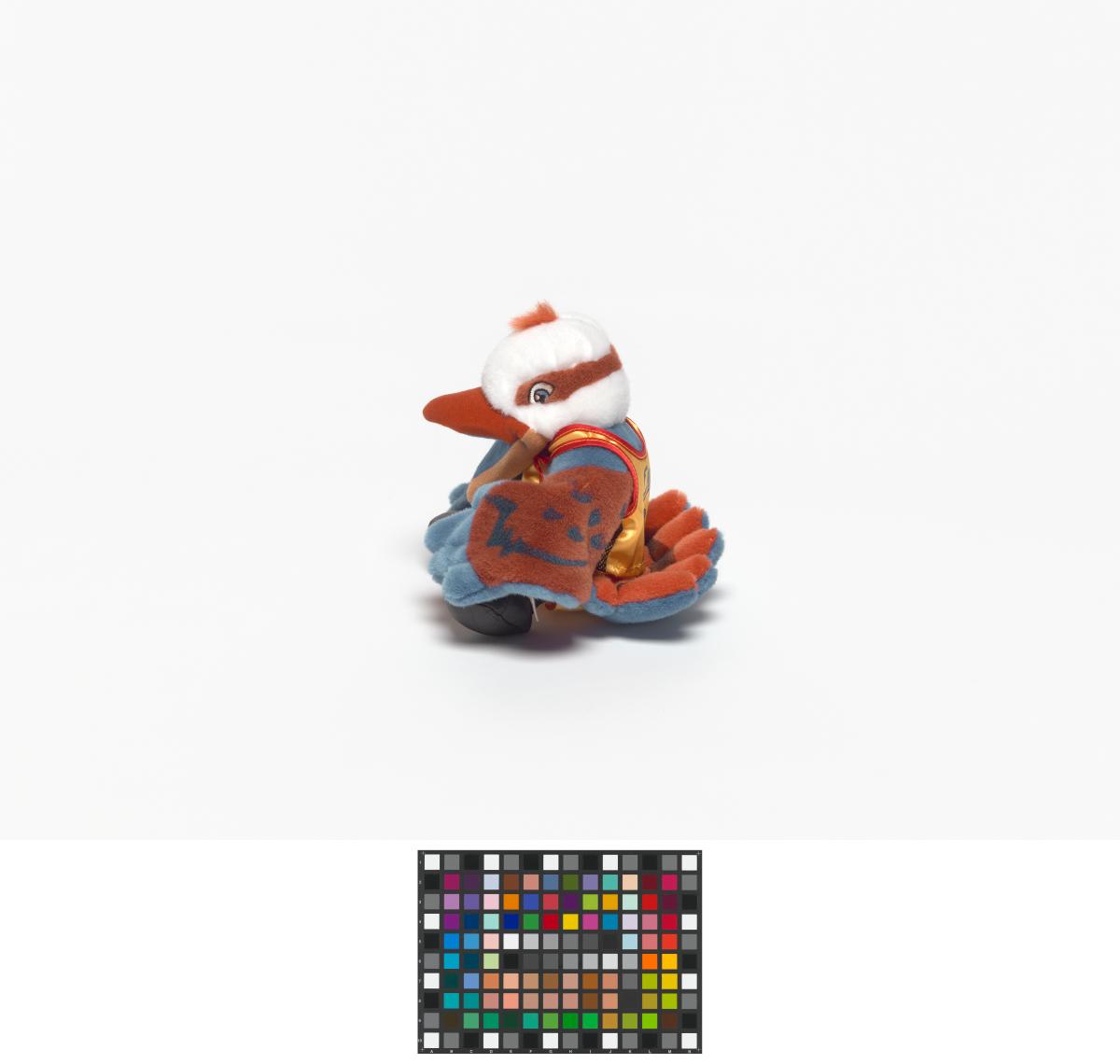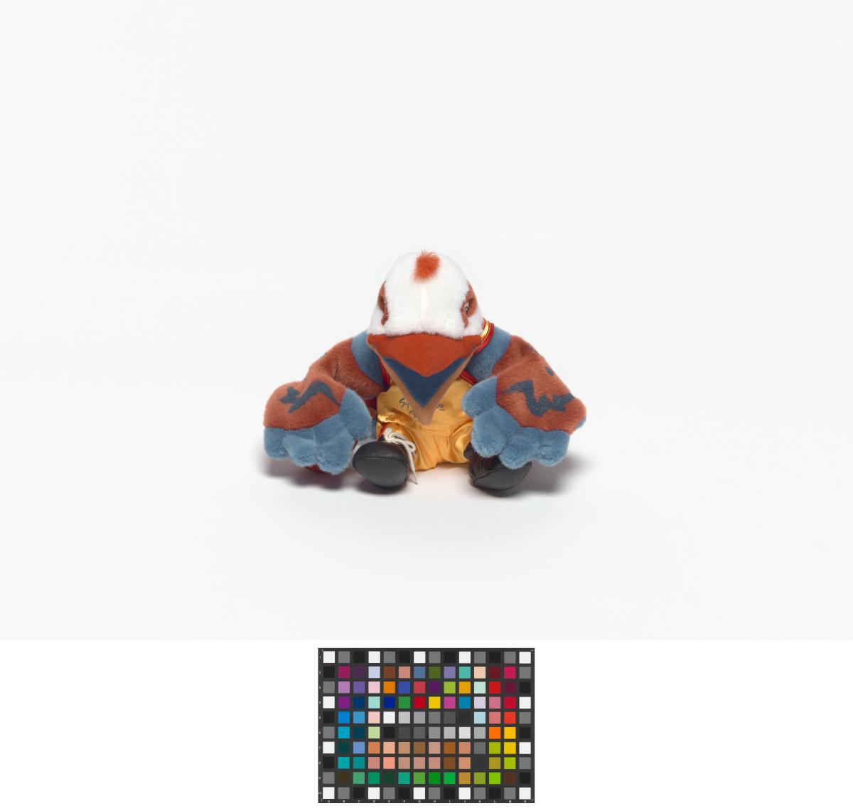 Kingfisher shape stuffed toy. Its wearing an orange basketball suit.