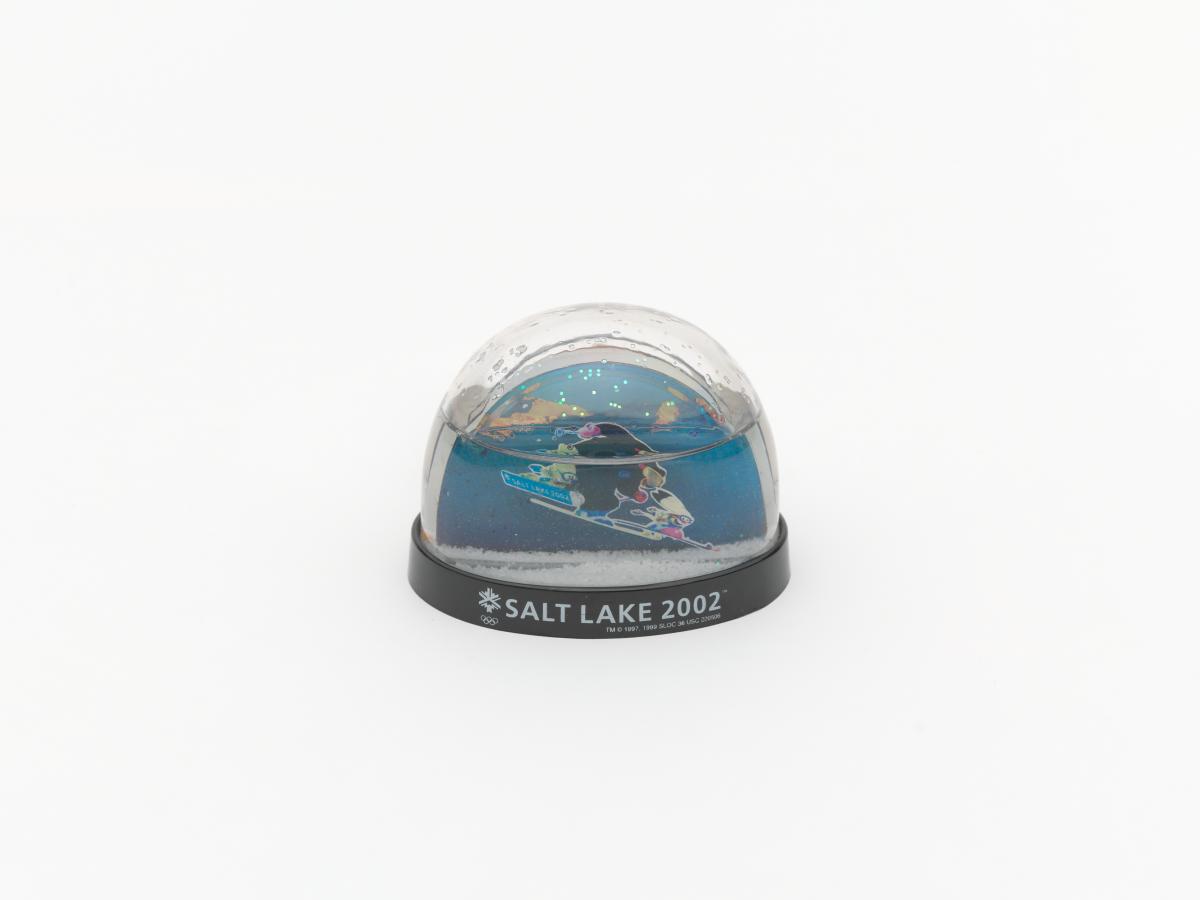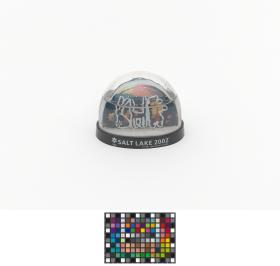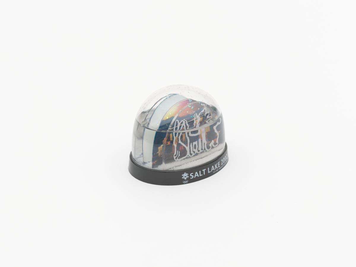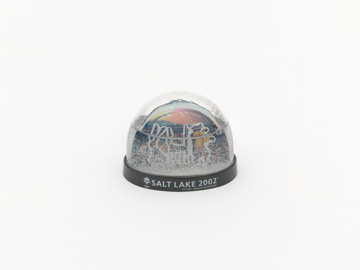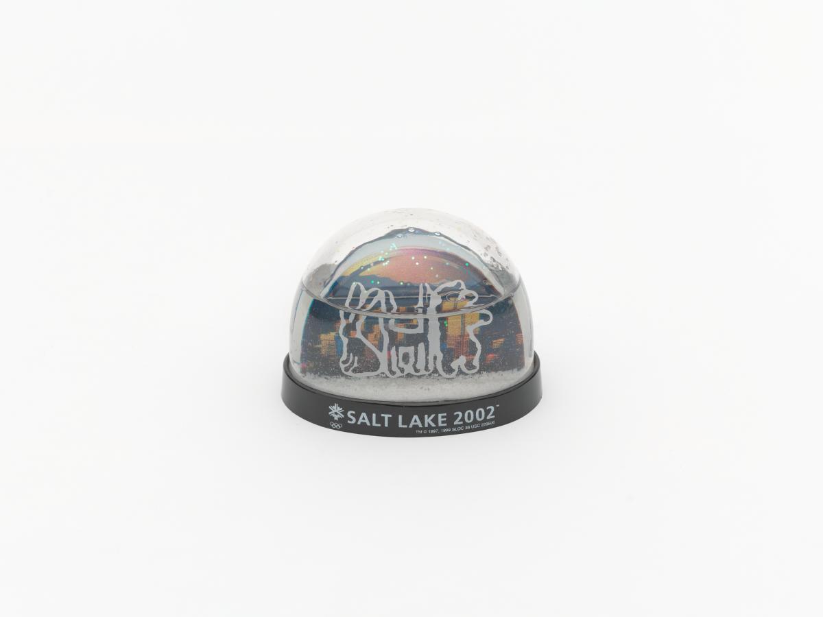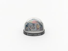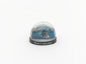 Snow globe with the mascots on a sledge on one side and the petroglyphs mascots on the other.