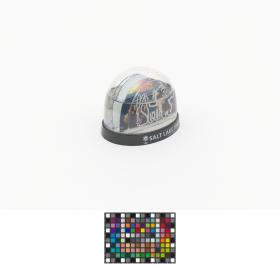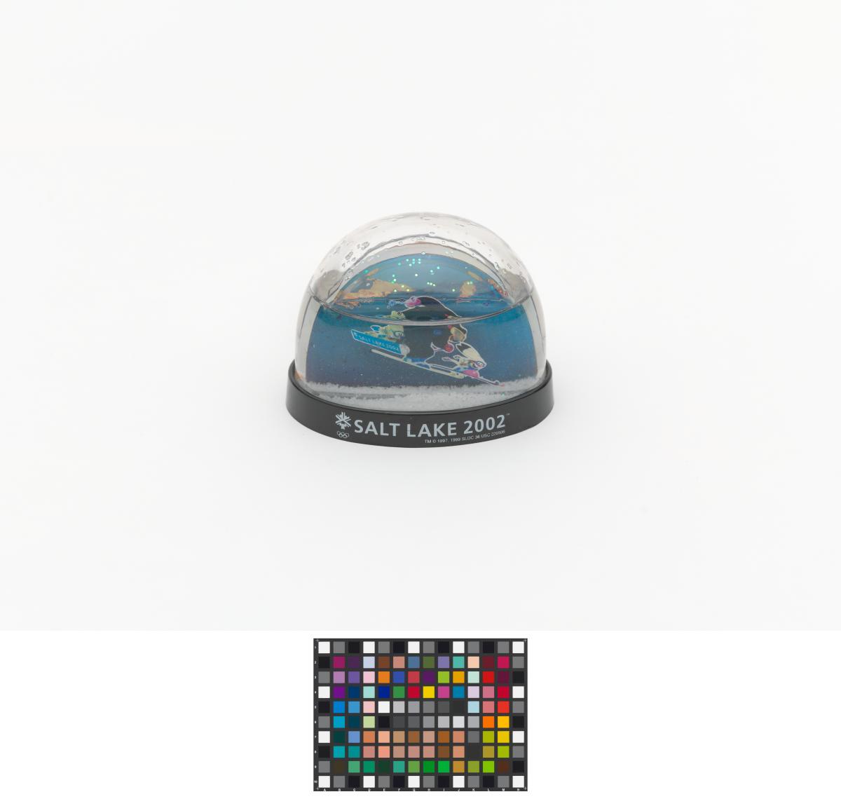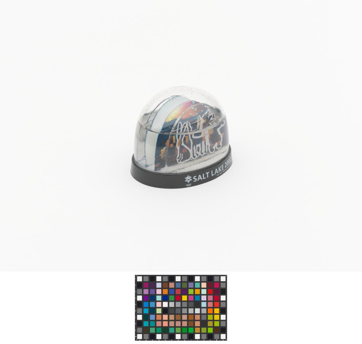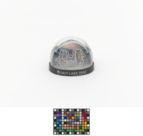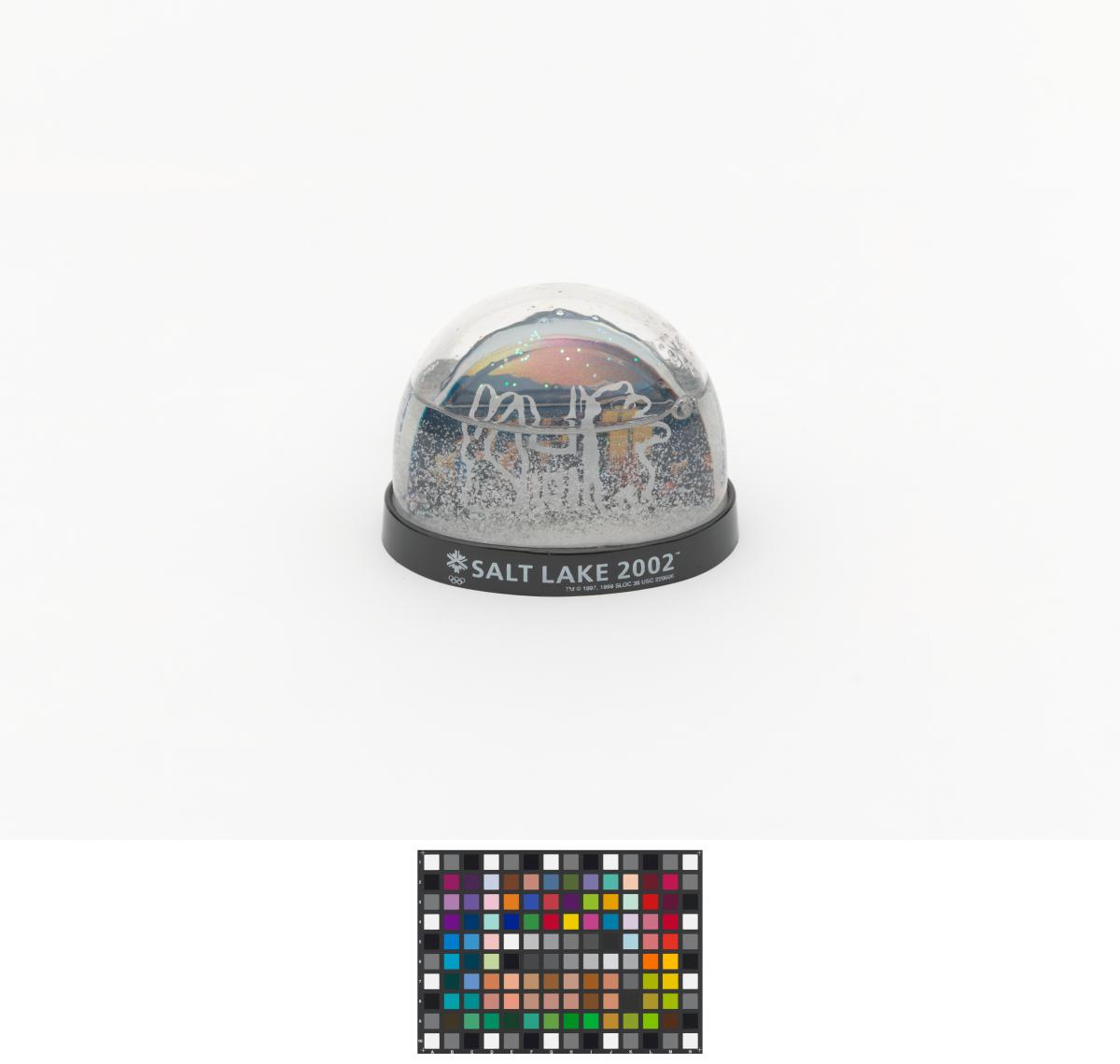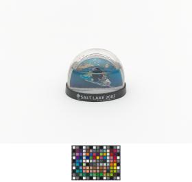 Snow globe with the mascots on a sledge on one side and the petroglyphs mascots on the other.