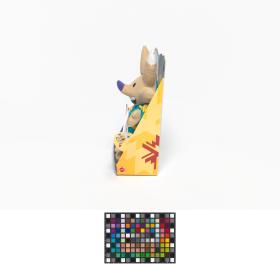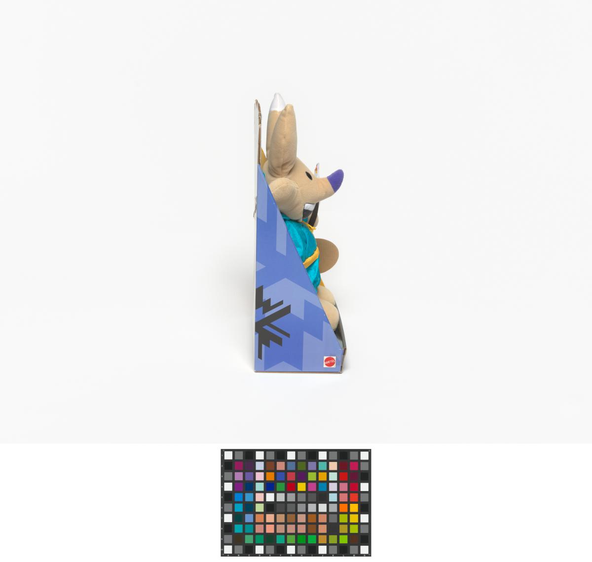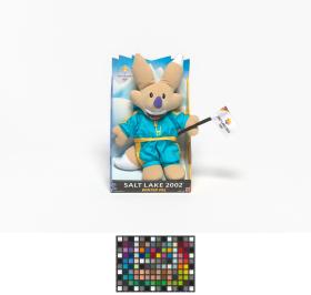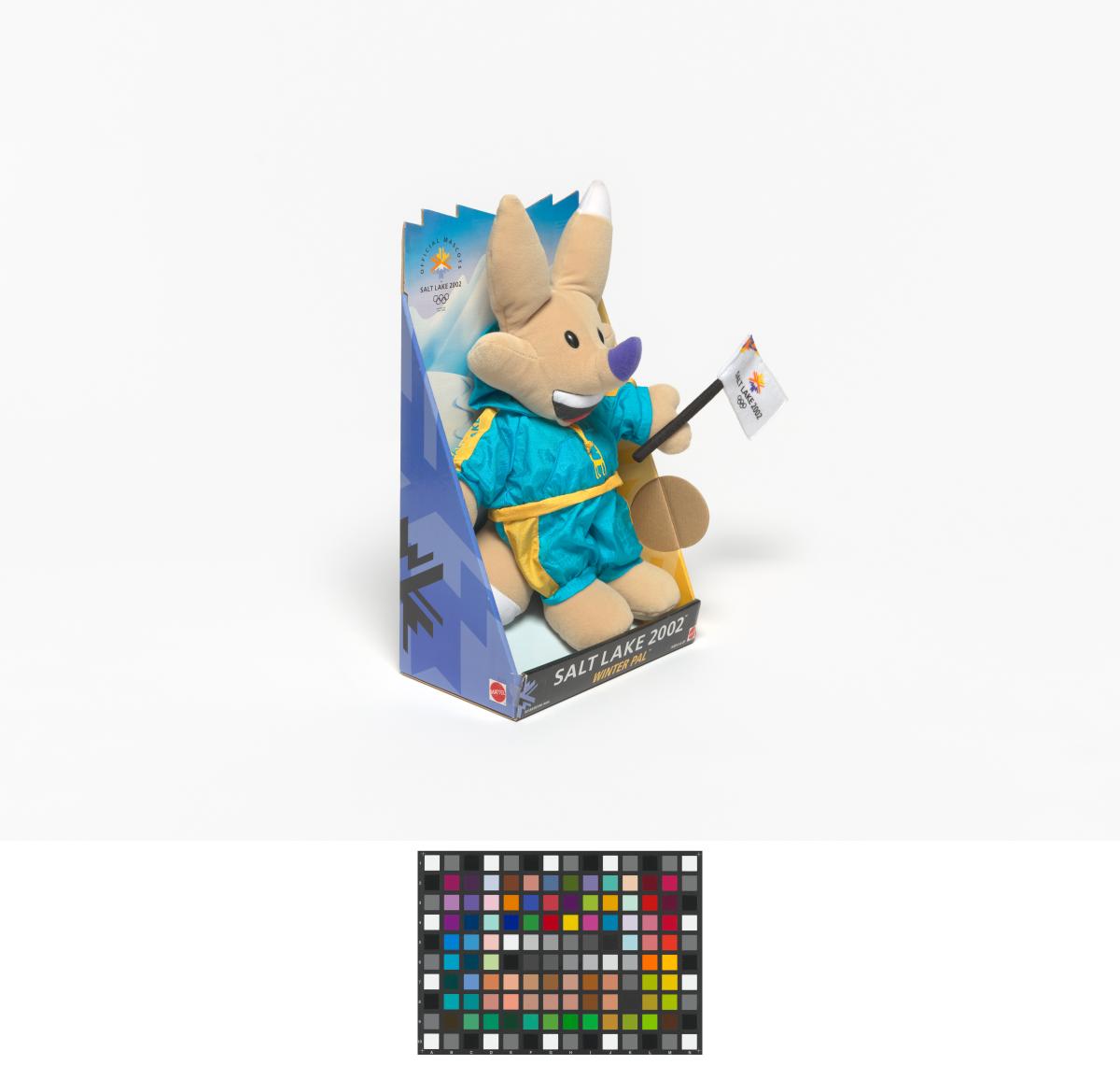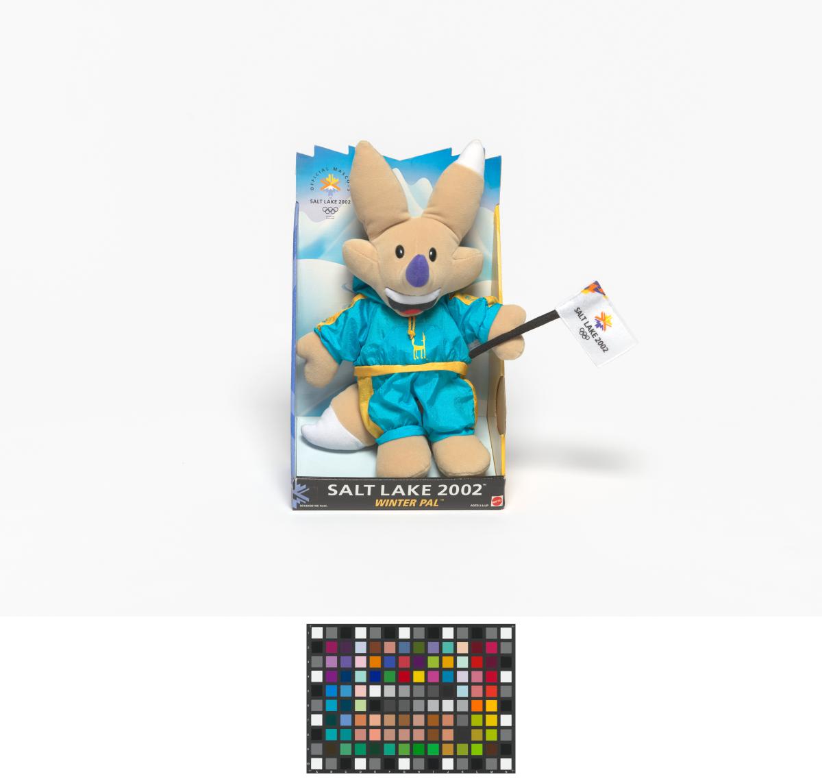 Salt Lake City 2002, Copper, one of the Games' mascots, wearing a turquoise snowsuit.