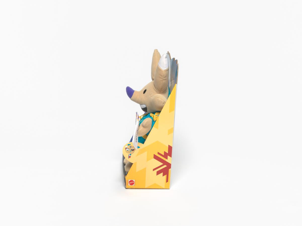 Copper mascot carrying a flag with the Games' Emblem.