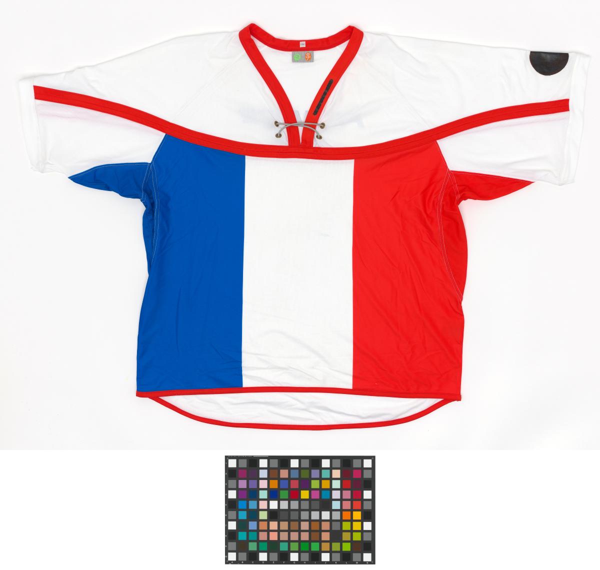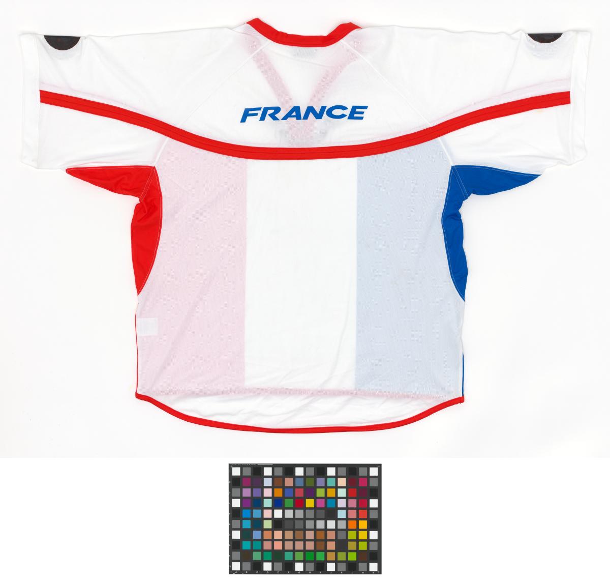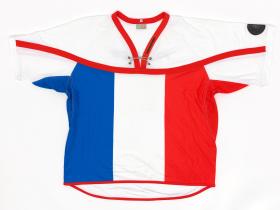 White jersey with French colors. Front: tied collar. Back: "France". Size L.