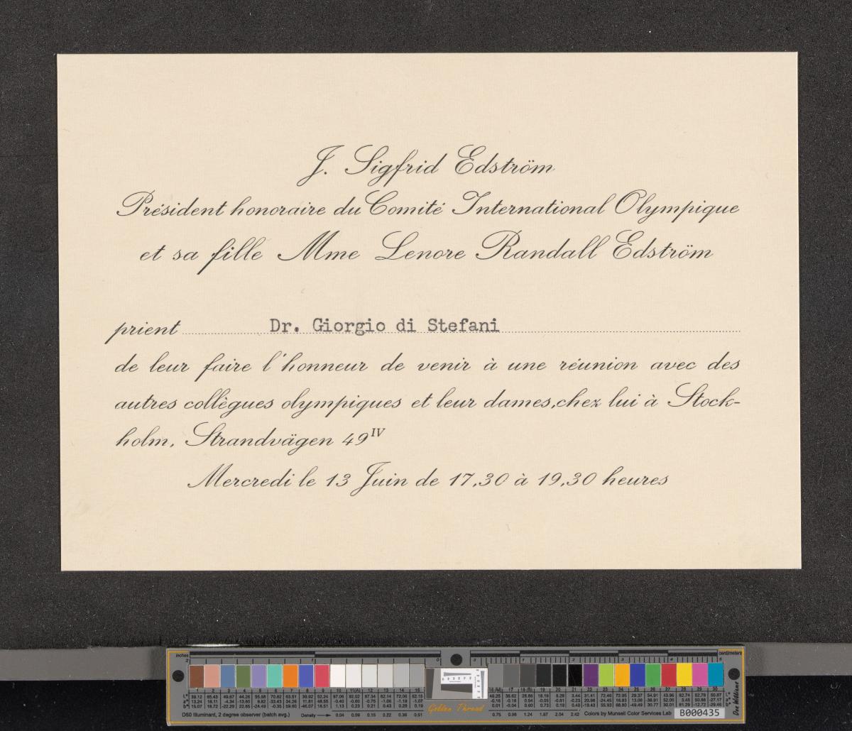 Text: "J. Sigfrid Edström / Président honoraire du Comité International Olympique / et sa fille Mme Lenore Randall Edström / prient Dr. Giorgio di Stefani / de leur faire l'honneur de venir à une réunion avec des / autres collègues olympiens et leur dames, chez lui à Stock- / holm, Strandvägen 49 IV / Mercredi le 13 Juin de 17,30 à 19,30 heures".