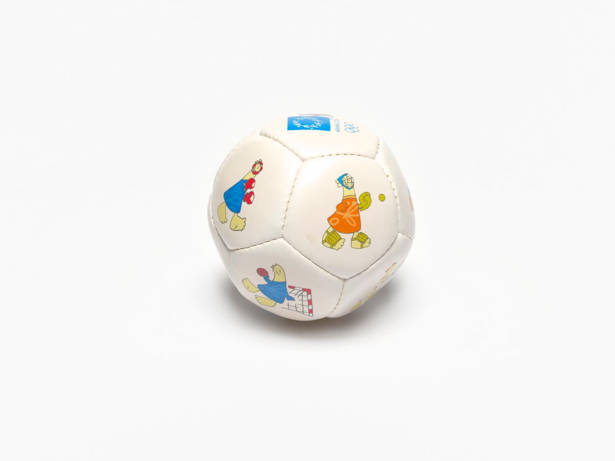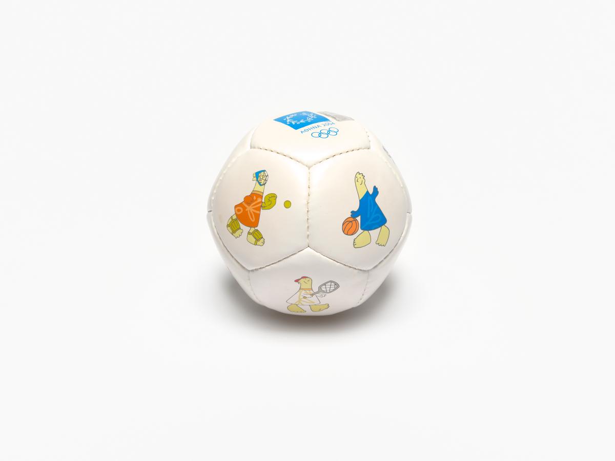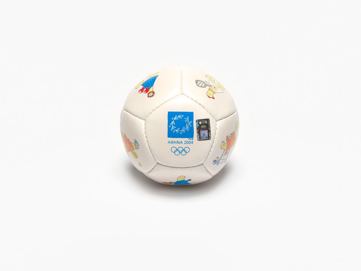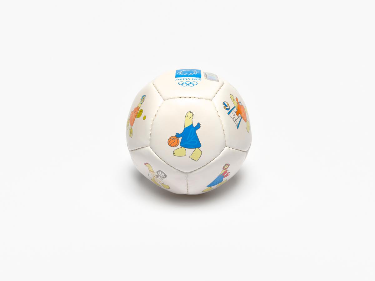 Athens 2004, ball with Athena and Phevos, the Games' mascots, practising various sports, and the Games' emblem.