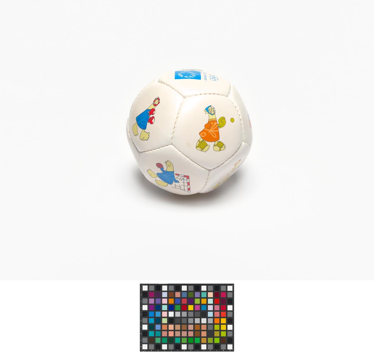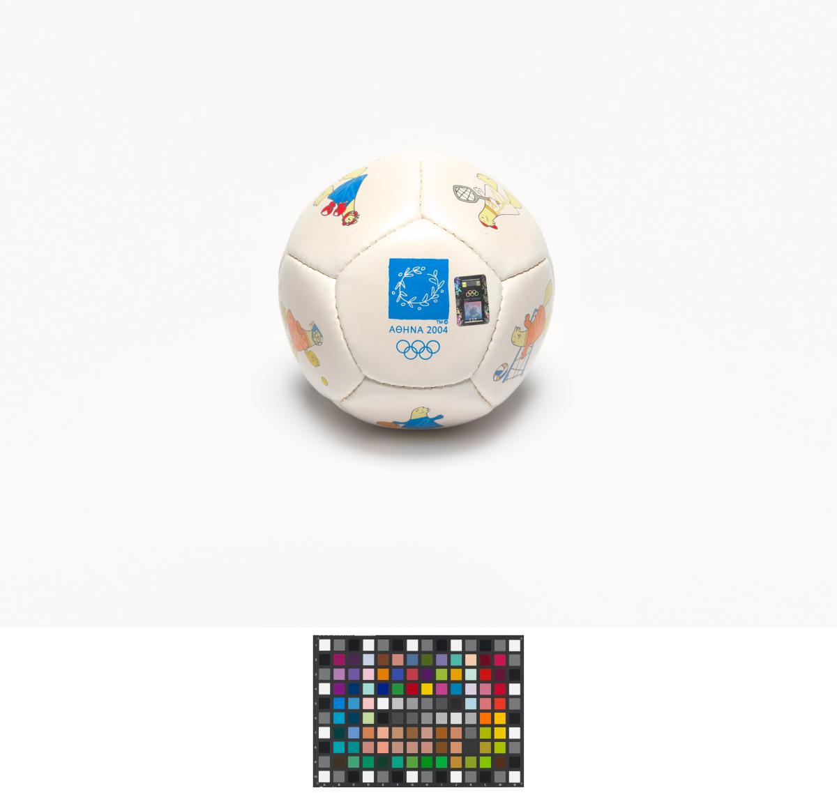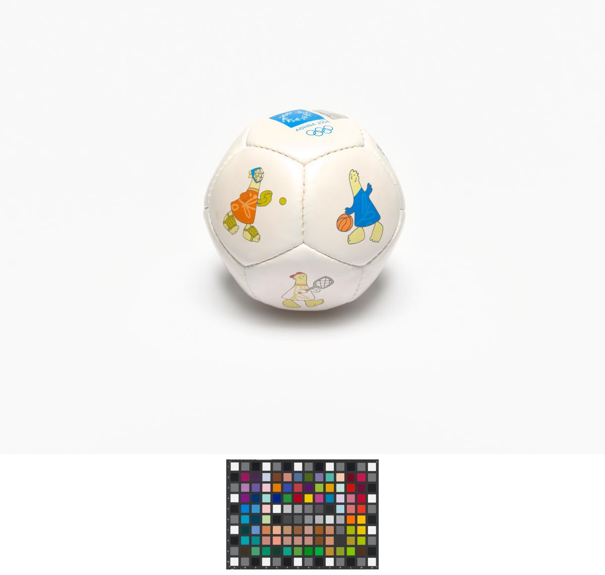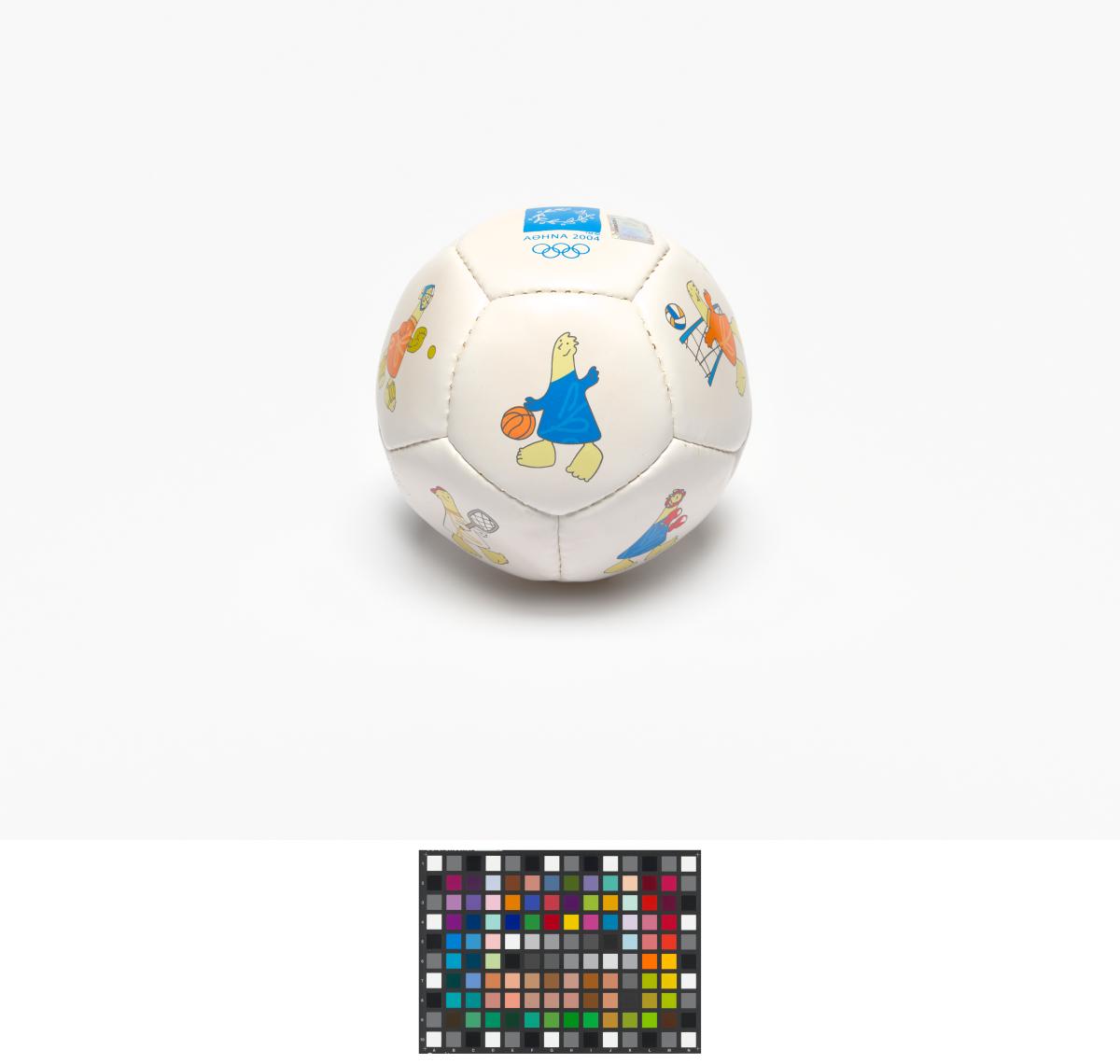 Athens 2004, ball with Athena and Phevos, the Games' mascots, practising various sports, and the Games' emblem.