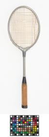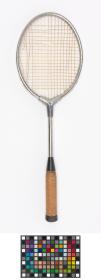 Metalic oval frame and octagonal wooden handle with leather butt. Damaged plastic stringing.