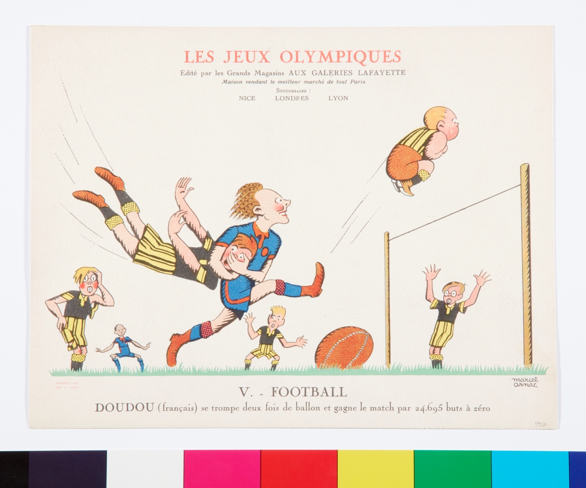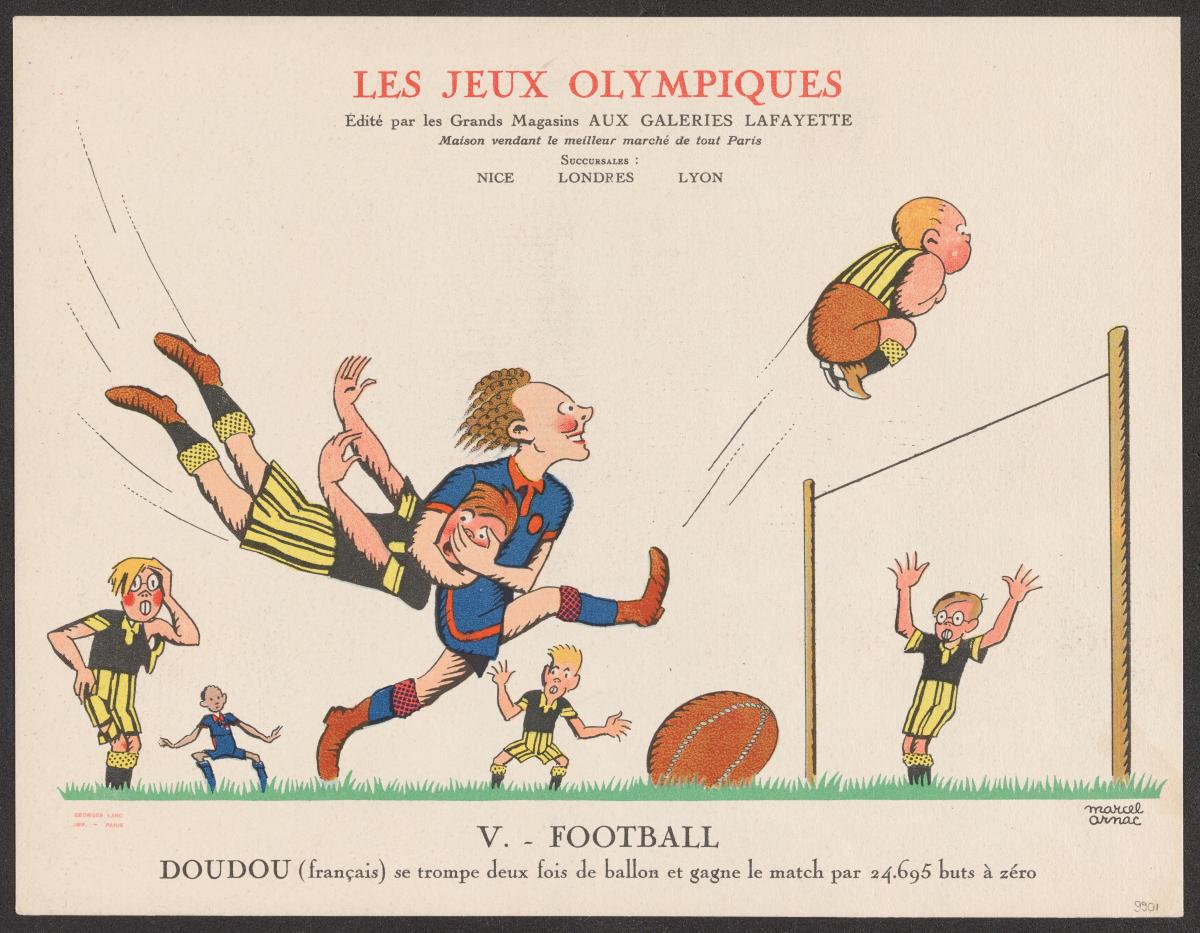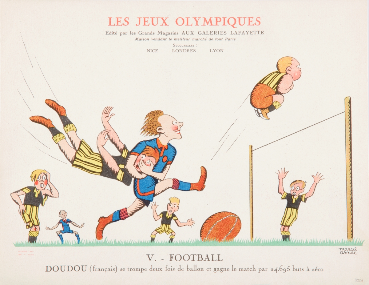 This general situation and the political and racial ideologies that stemmed from it were reflected in the sports cartoons drawn by Marcel Arnac, illustrator and pioneer of comic strips, for Galeries Lafayette.