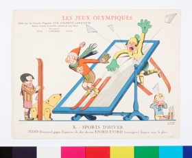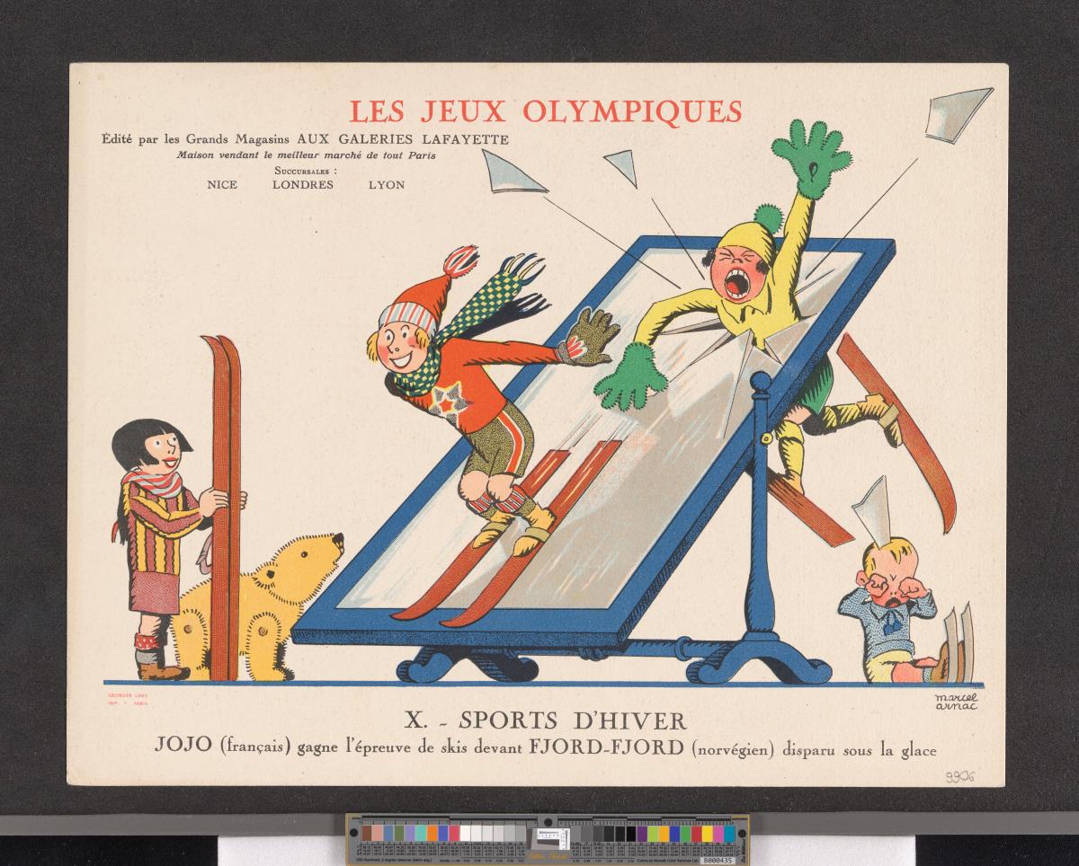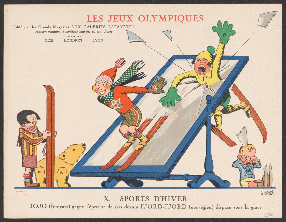 This general situation and the political and racial ideologies that stemmed from it were reflected in the sports cartoons drawn by Marcel Arnac, illustrator and pioneer of comic strips, for Galeries Lafayette.