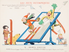 This ski race is taking place in a child’s bedroom, on a rather short slope in the form of a mirror. French skier Jojo wins the race thanks to his Norwegian opponent, Fjord Fjord, disappearing under the “ice”. With the Norwegians dominating winter sports in the 1920s, this poster was one way in which France could manage to win.