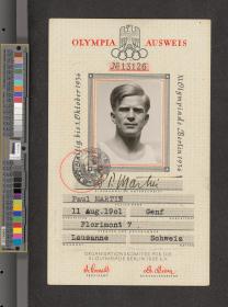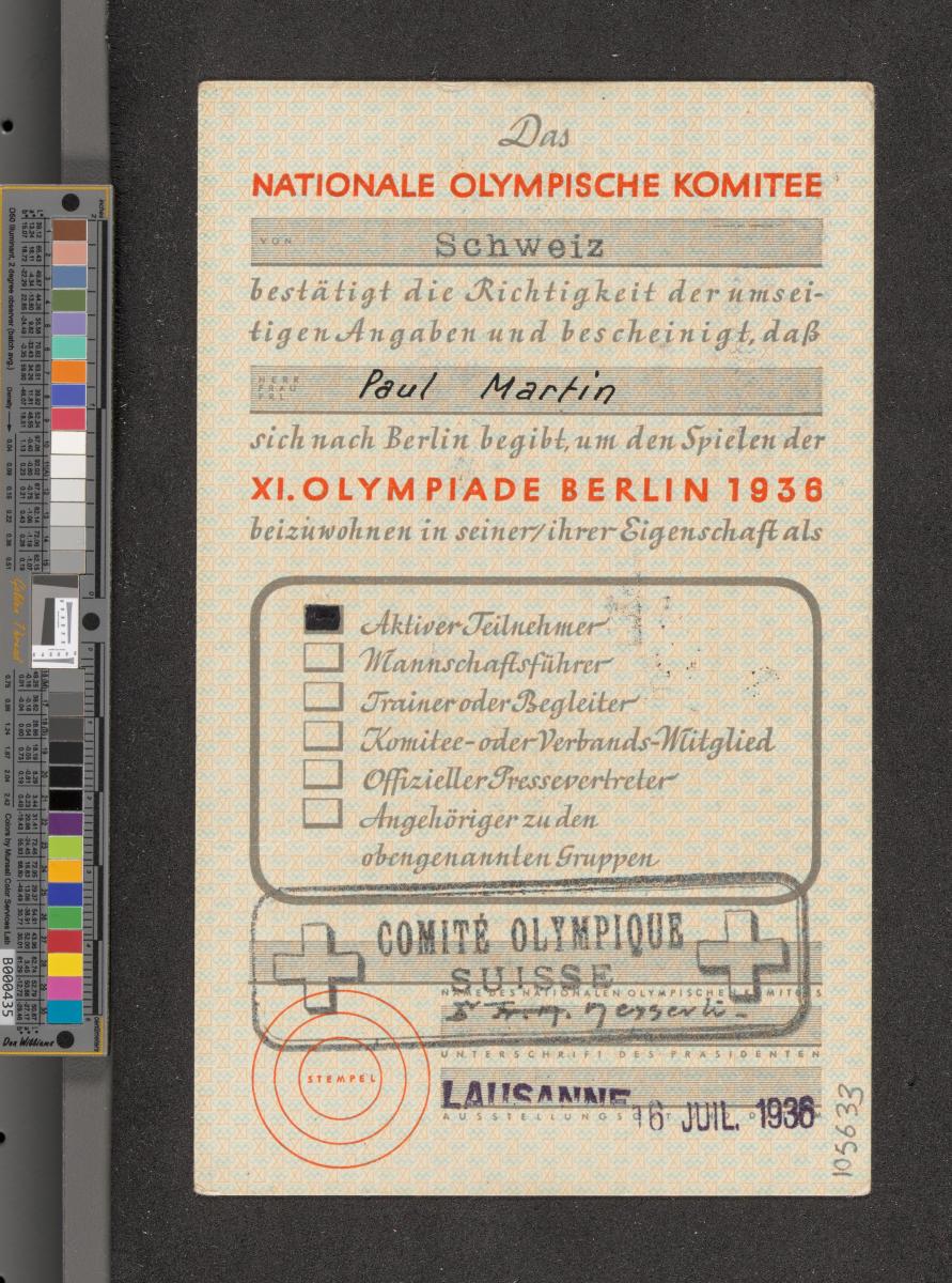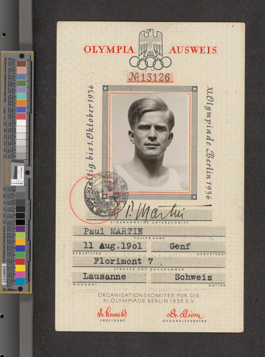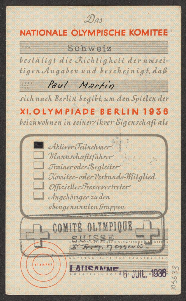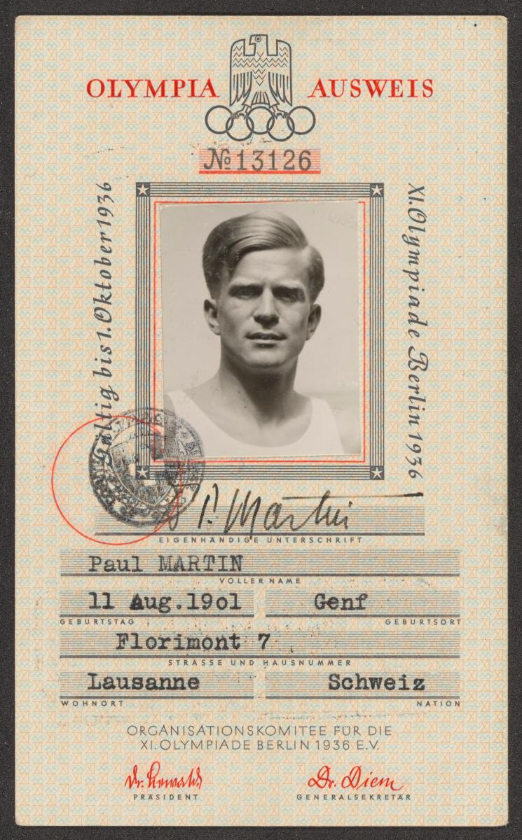 Berlin 1936, identity card issued for Paul MARTIN (SUI), 800m silver medallist.
