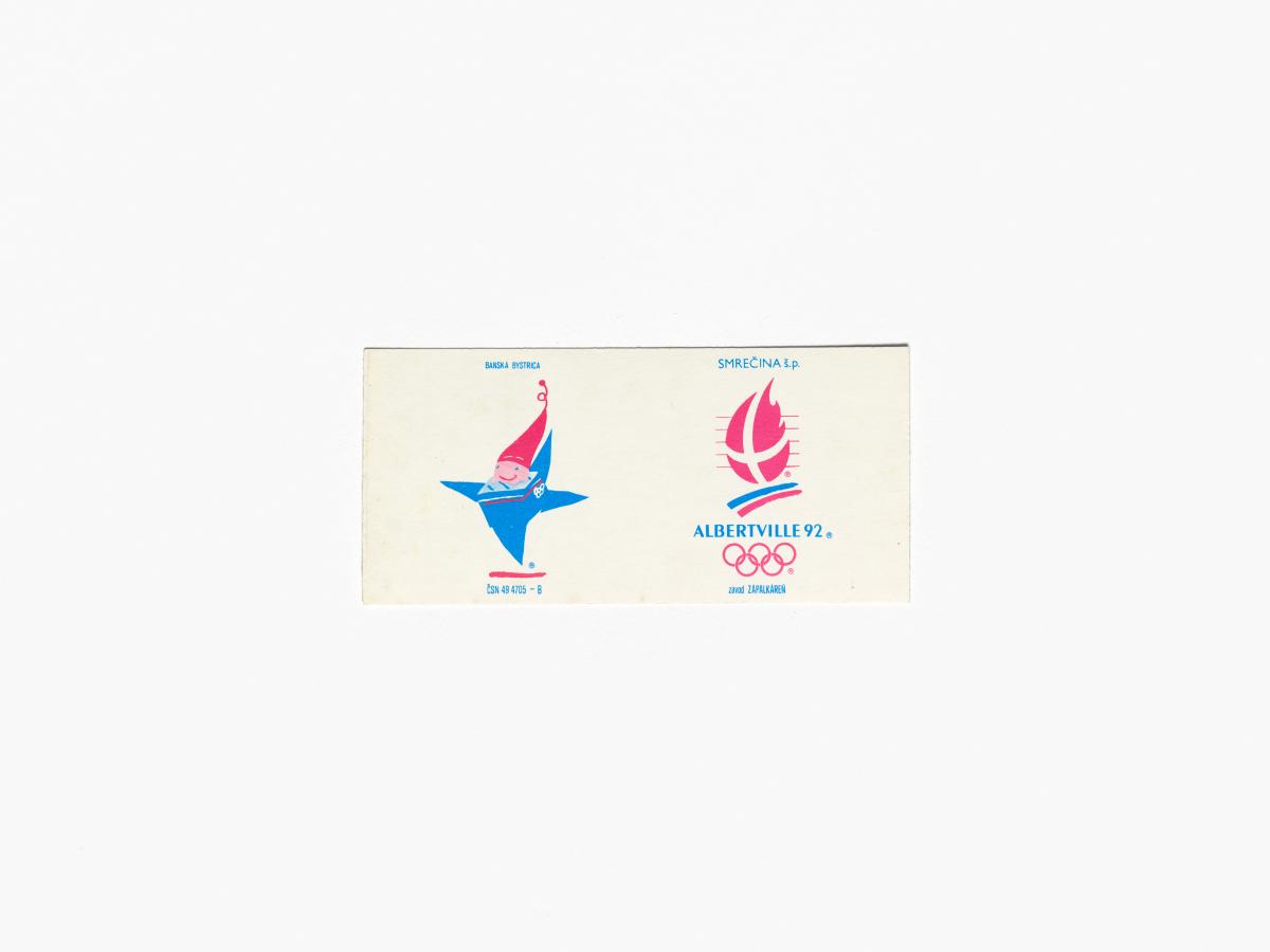 Albertville 1992, matchbox with the Games' emblem and Magic, the Games' mascot, dancing.