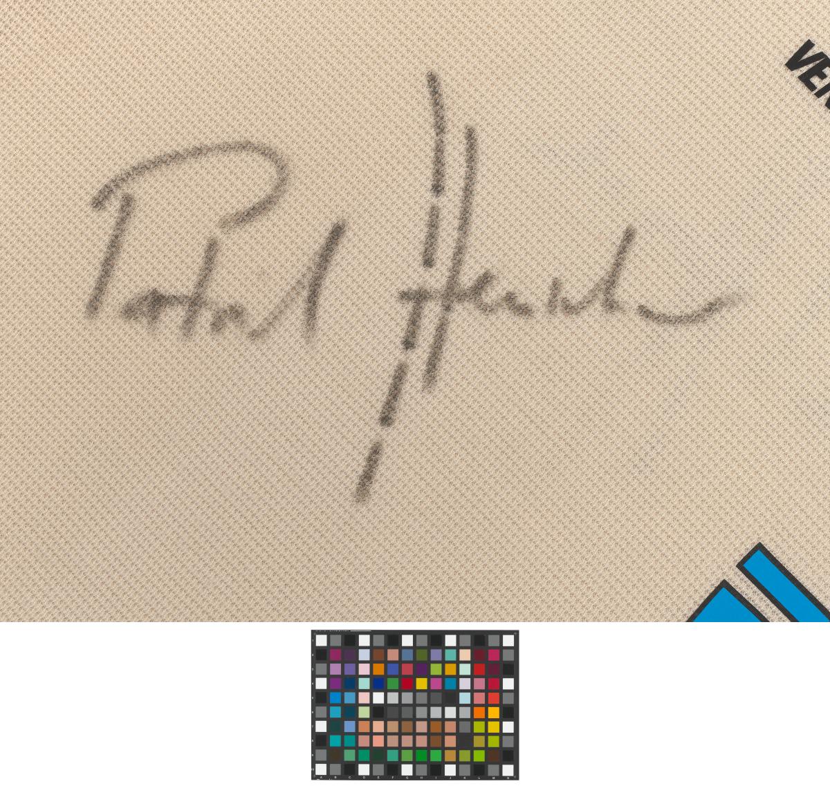 Face fronte: on the right, Venice Beach logo; on the left, Swiss flag with - raised" - the brand's logo. Caption: "FIVB, 2". Athlete's signature. Back side, caption: "Heuscher, FIVB, 2". Athlete's signature. Size XL.