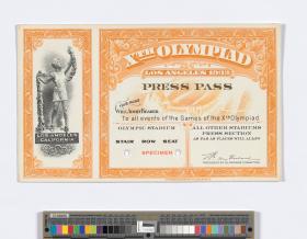 Pass for the press with on the left reproduction of the official poster and on the right in the background the Olympic Stadium. Text: "Xth OLYMPIAD / LOS ANGELES 1932 / PRESS PASS / To all events of the Games of the Xth Olympiad.".