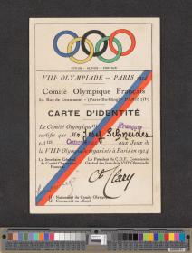 Card with the Olympic rings and the Olympic Motto and photgraph and signature of the athlete and visa of the Swiss Olympic Committee.