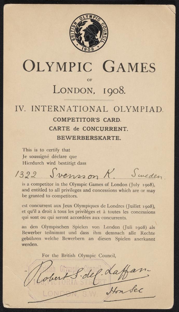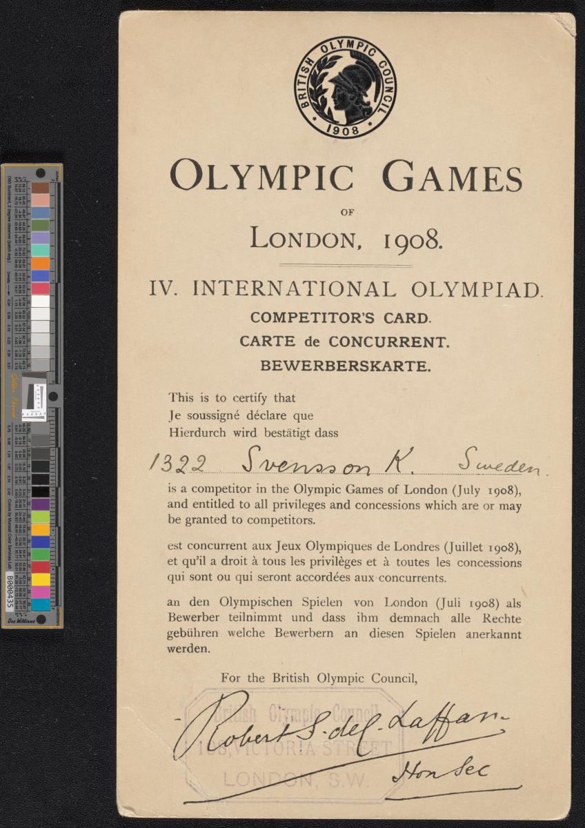 London 1908, competitor's card of Karl Johan SVENSSON (SWE), artistic gymnastics team Olympic champion.