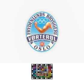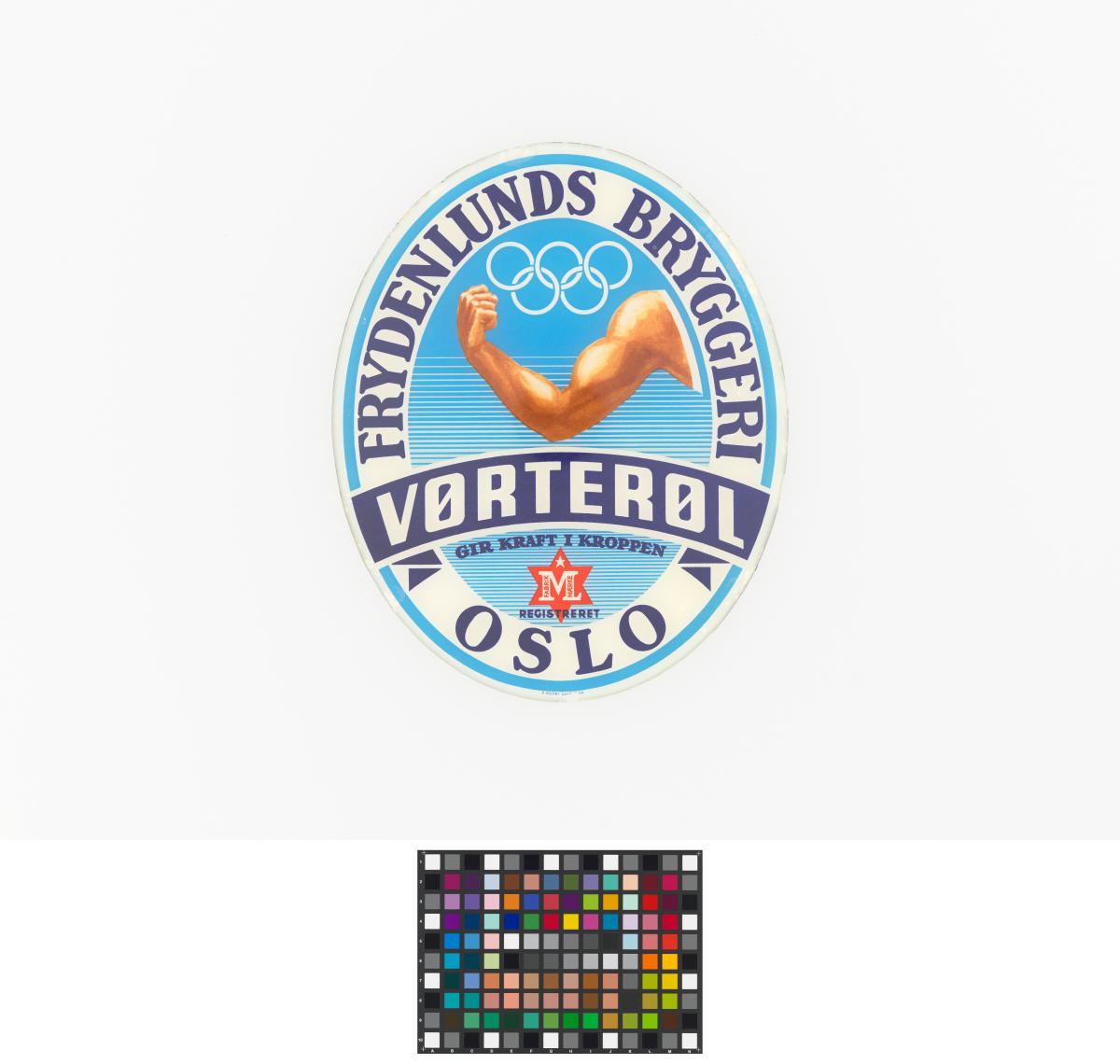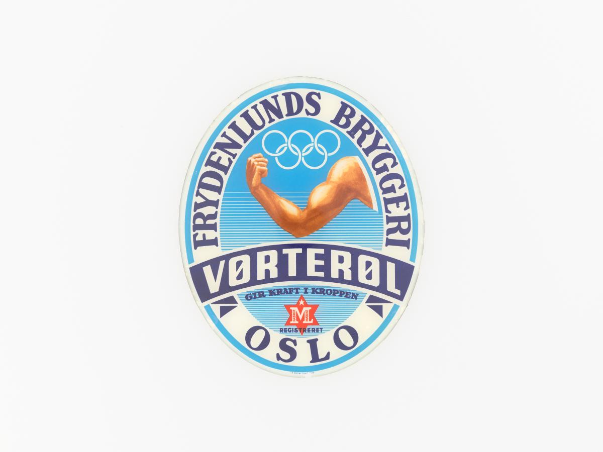 Drawing of a muscular arm and of the Olympic symbol. Caption: "Frydenlunds Bryggeri, Vorterol Gir Kraft I Kroppen".