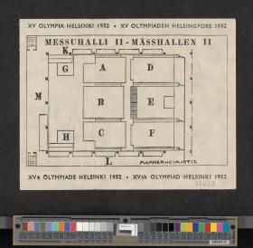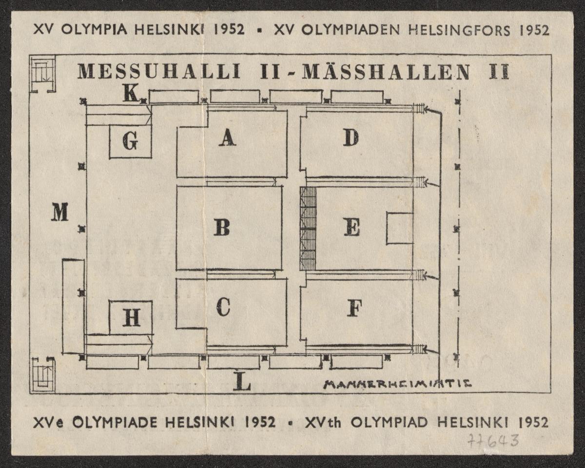 Pattern of the poster with Paavo Nurmi running with the olympic rings on the background. Map of the hall on the back. Detached coupon.