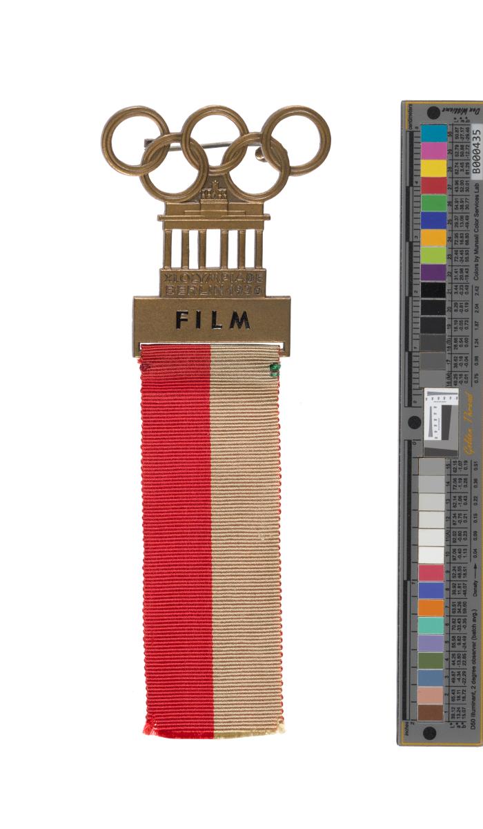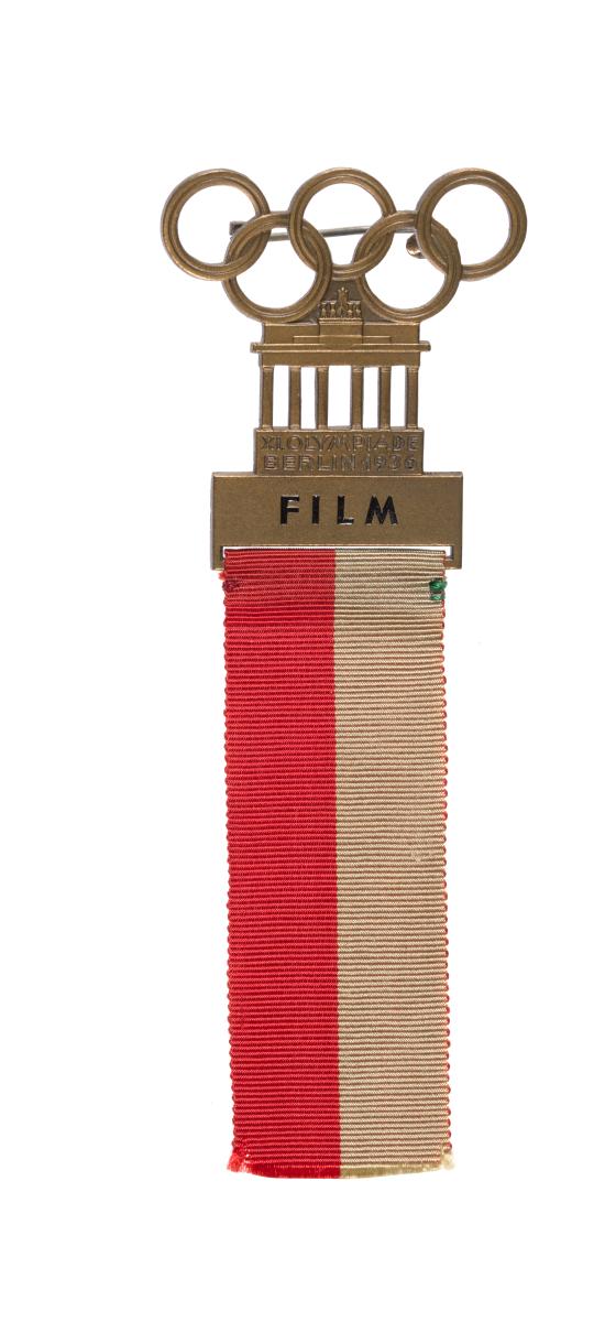 Badge with green and red ribbon. Olympic Symbol, Brandenburg Gate and caption: "XI. OLYMPIADE / BERLIN 1936 / FILM".
