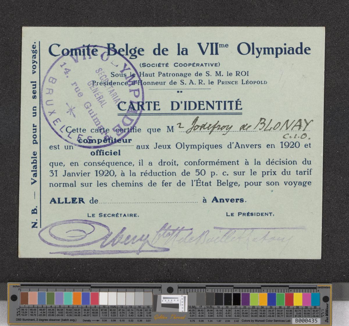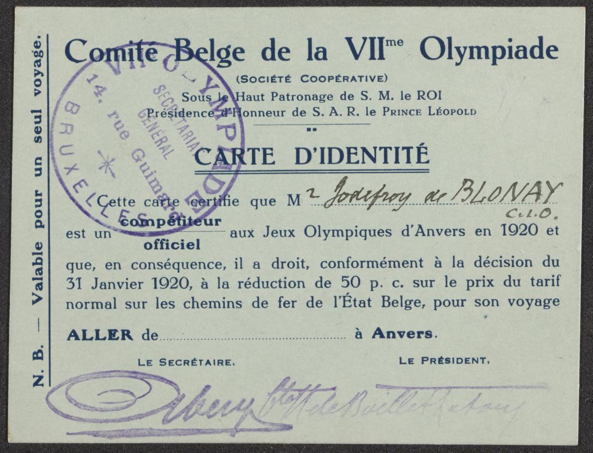 Antwerp 1920, identity card issued for Baron Godefroy de Blonay, IOC member.