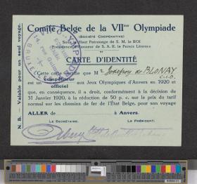 card offering a reduction of 50 % on the railways for his trip. Text in French. Stamp of the Secretary General of the Games in Brussels. Card signed by Henri de Baillet-Latour.