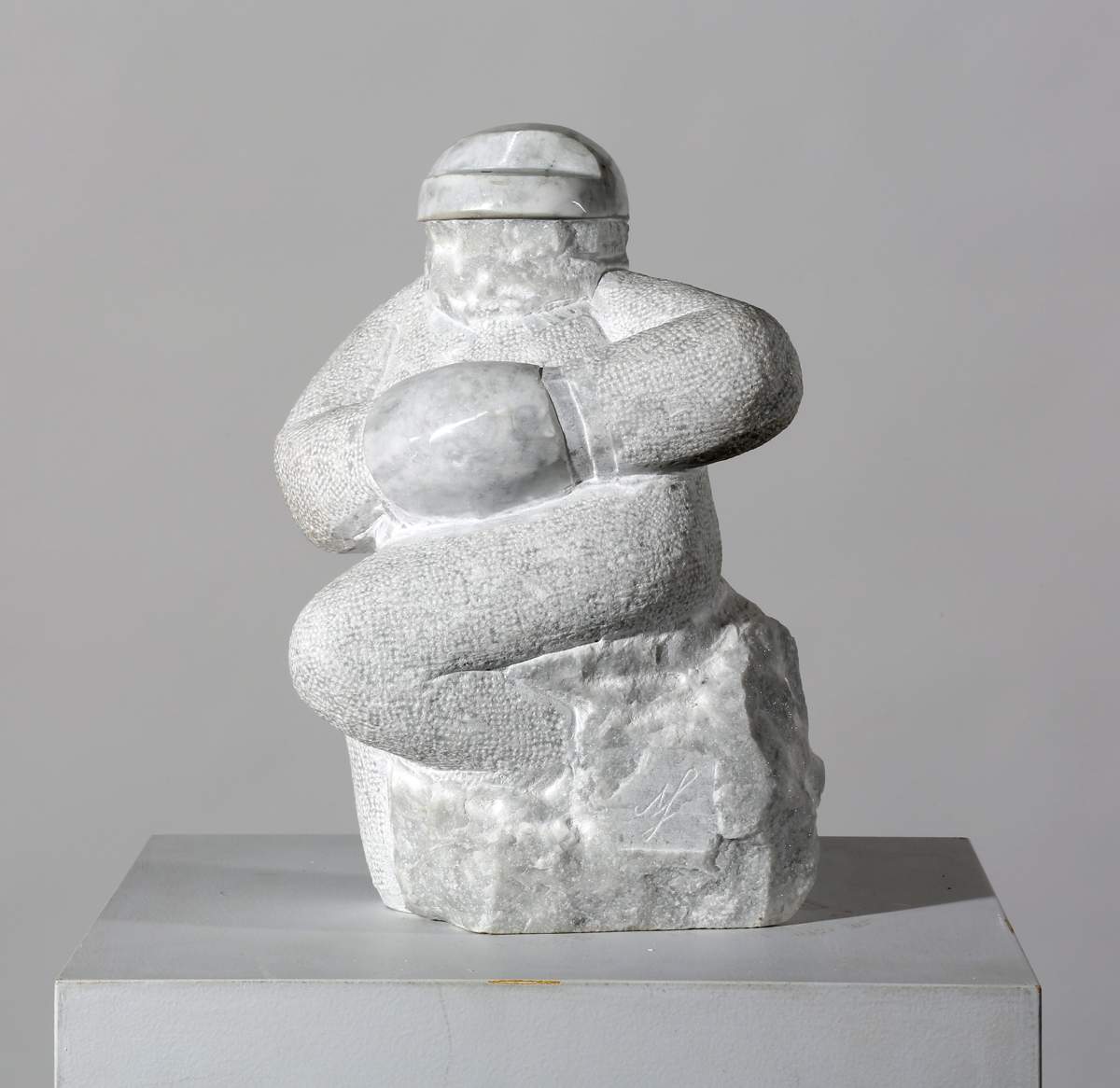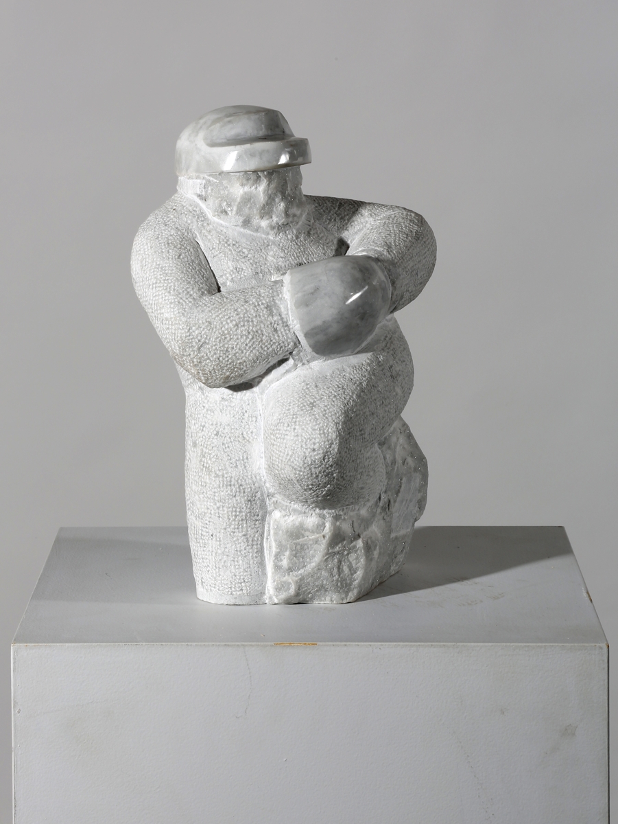 Sculpture of a baseball player preparing himself to catch the ball. The marble has different degrees of polishing.