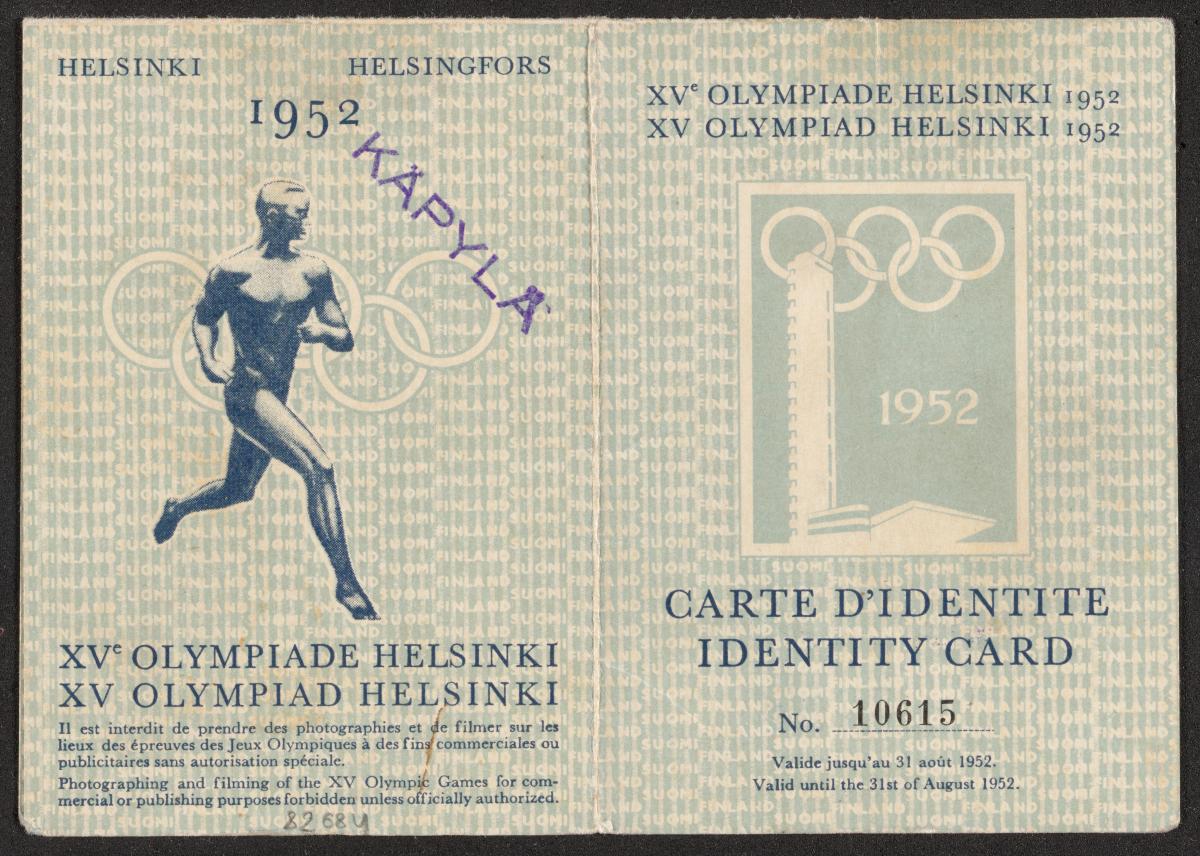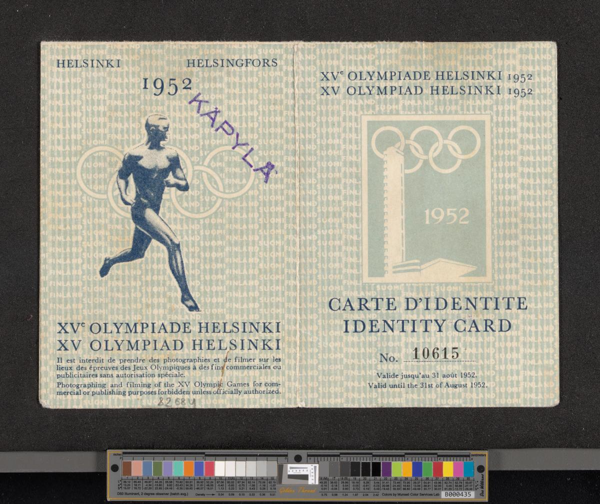 Identity card Nr. 10615. With the photograph of the athlete. Emblem of the Games on the cover and Paavo Nurmi running in front of the Olympic rings on the back.