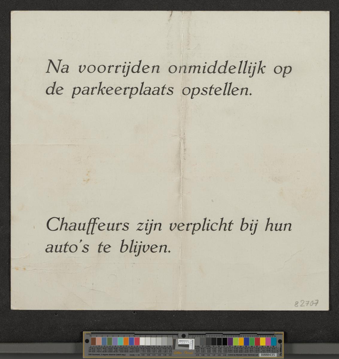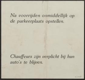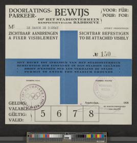With the graphic line of the Games. Text "Doorlatings Parkeer Bewijs". Signed by Hight Commissioner Van Politie. Nr. 150. This pass was valid for 5, 6, 7 and 8.