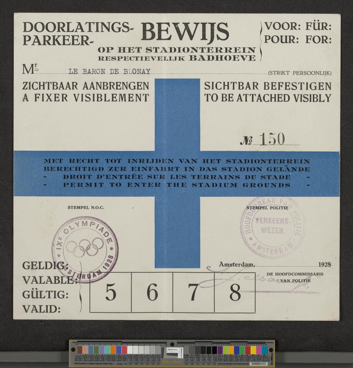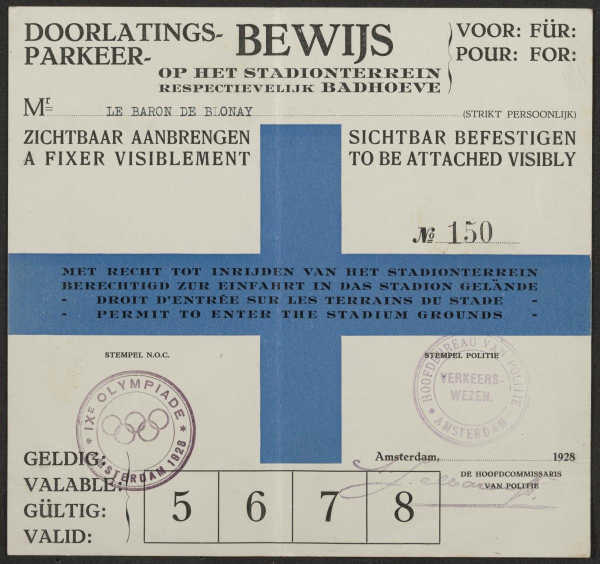 Amsterdam 1928, free pass to the Olympic Stadion given to Baron Godefroy de Blonay, IOC member.