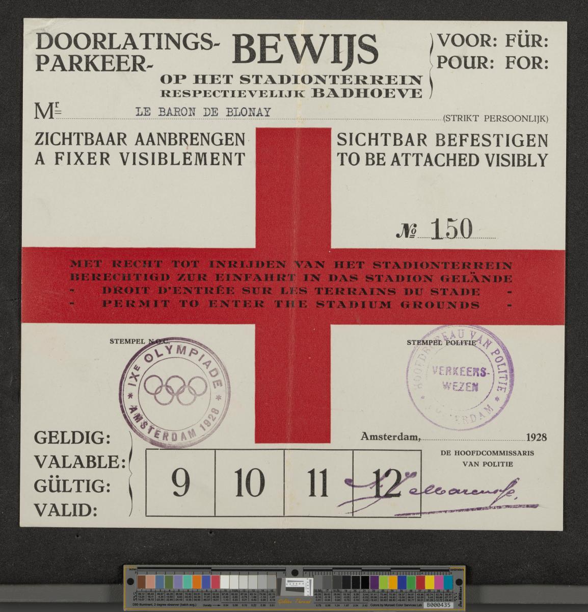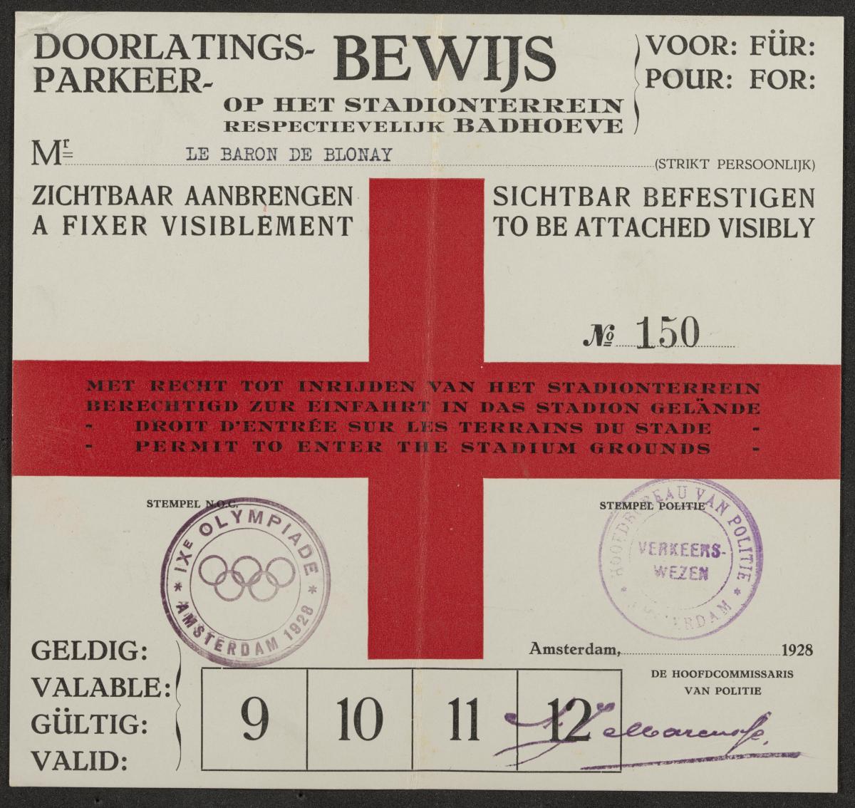 Amsterdam 1928, free pass to the Olympic Stadion given to Baron Godefroy de Blonay, IOC member.