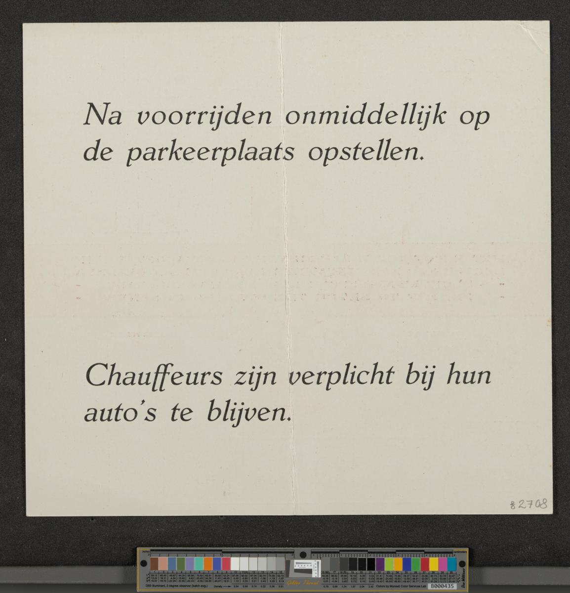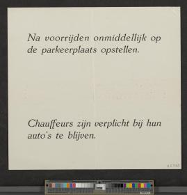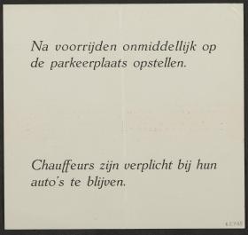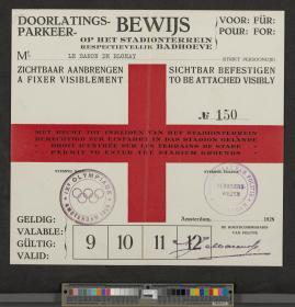 With the graphic line of the Games. Text "Doorlatings Parkeer Bewijs". Signed by Hight Commissioner Van Politie. Nr. 150. This pass was valid for 9, 10, 11 and 12.