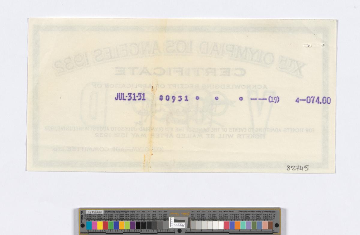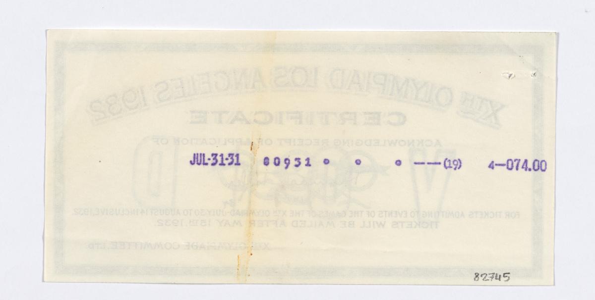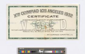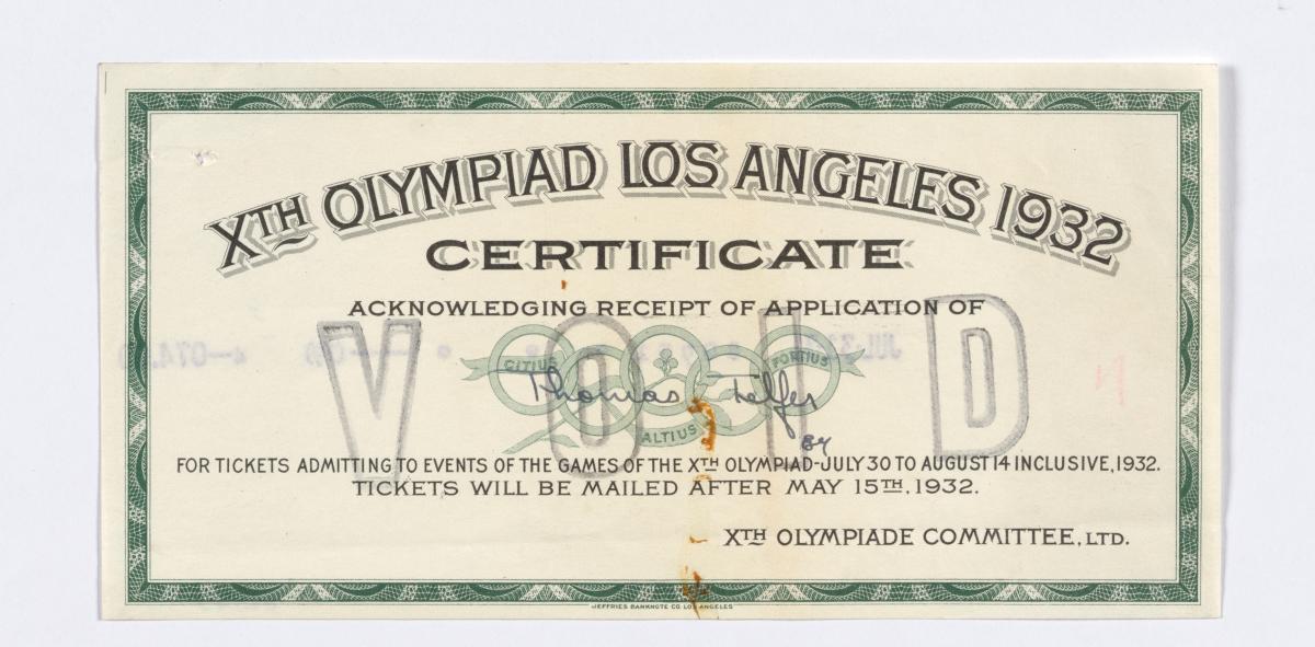 Receipt with the Olympic rings associated with the Olympic motto in the center. Caption: "Xth OLYMPIAD LOS ANGELES 1932 / CERTIFICATE / AKNOLEDGING RECEIPT OF APPLICATION OF / Thomas Telfer / FOR TICKETS ADMITTING TO EVENTS OF THE GAMES OF THE Xth OLYMPIAD-JULY 30 TO AUGUST 14 INCLUSIVE, 1932. / TICKETS WILL BE MAILED AFTER MAY 15th, 1932.".