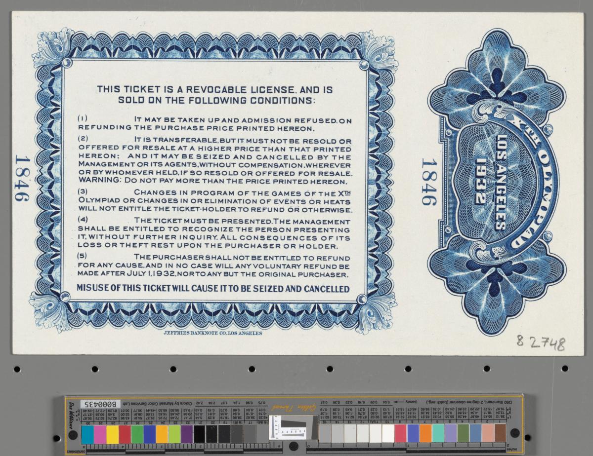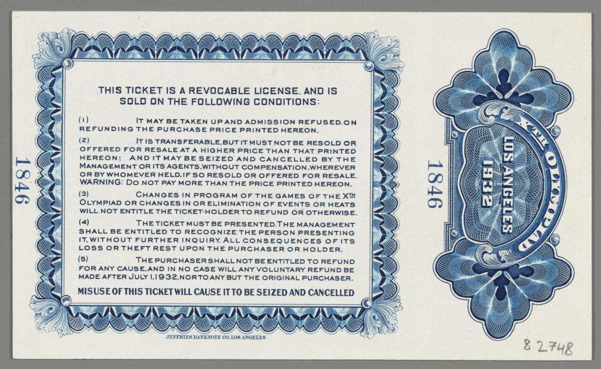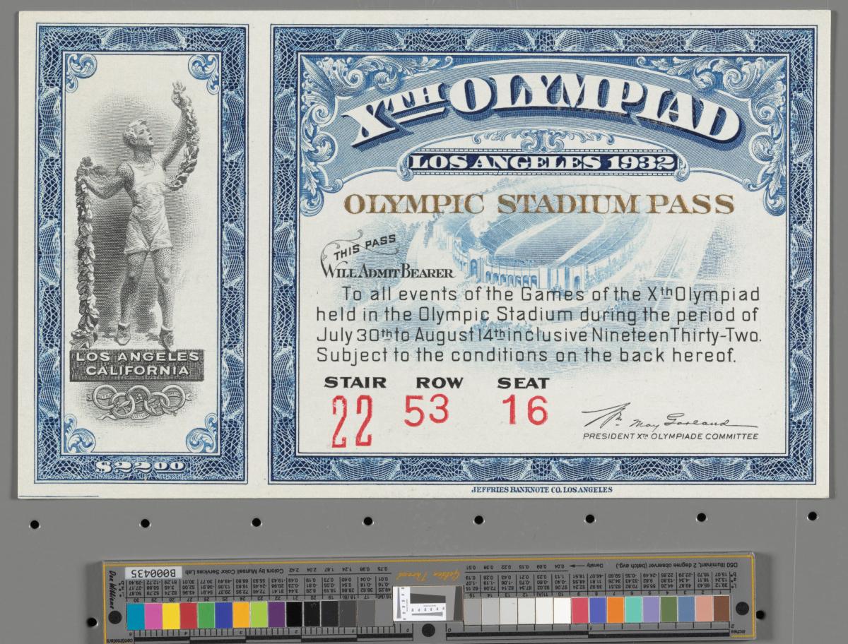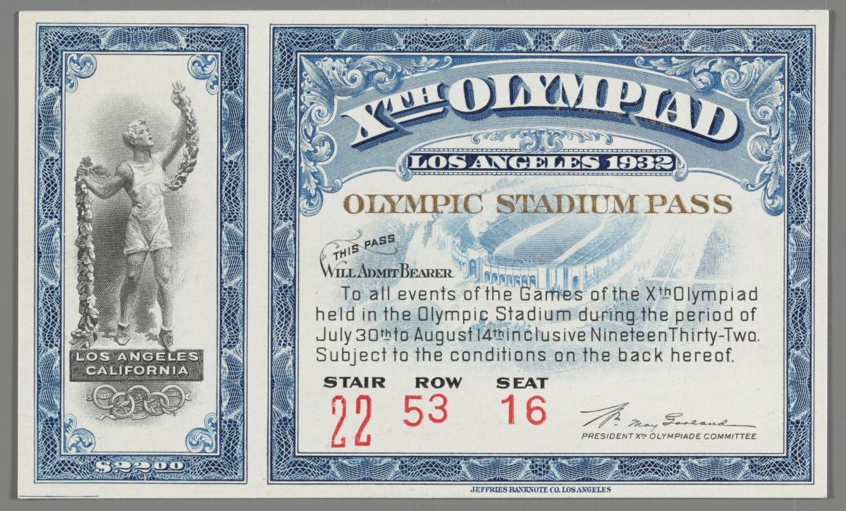 Los Angeles 1932, free pass to the Olympic stadium for all events.