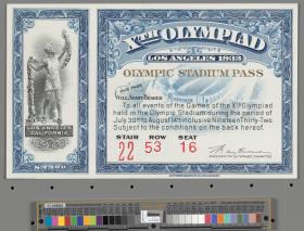 Pass with the reproduction of the official poster on the left and of the Olympic Stadium on the right. text: "Xth OLYMPIAD / LOS ANGELES 1932 / OLYMPIC STADIUM PASS". General conditions printed on the back. Price 22.00 USD.