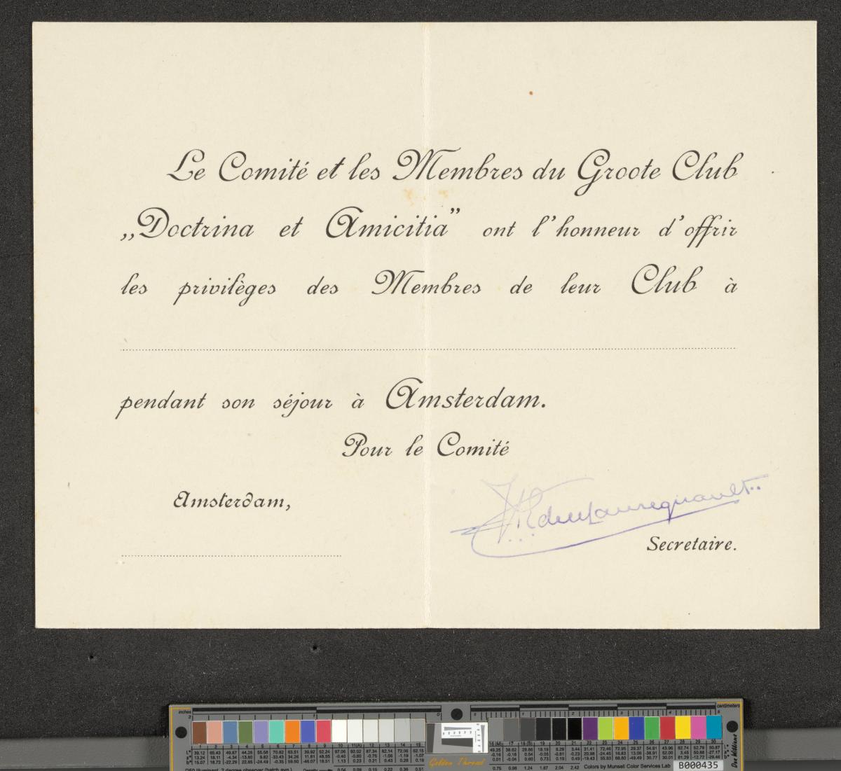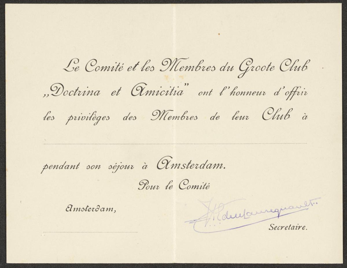 Caption: “La Comité et les Membres du Groote Club / -Doctrina et Amicitia- ont l’honneur d’offrir / les privilèges des Membres de leur Club à / […] / pendant son séjour à Amsterdam".