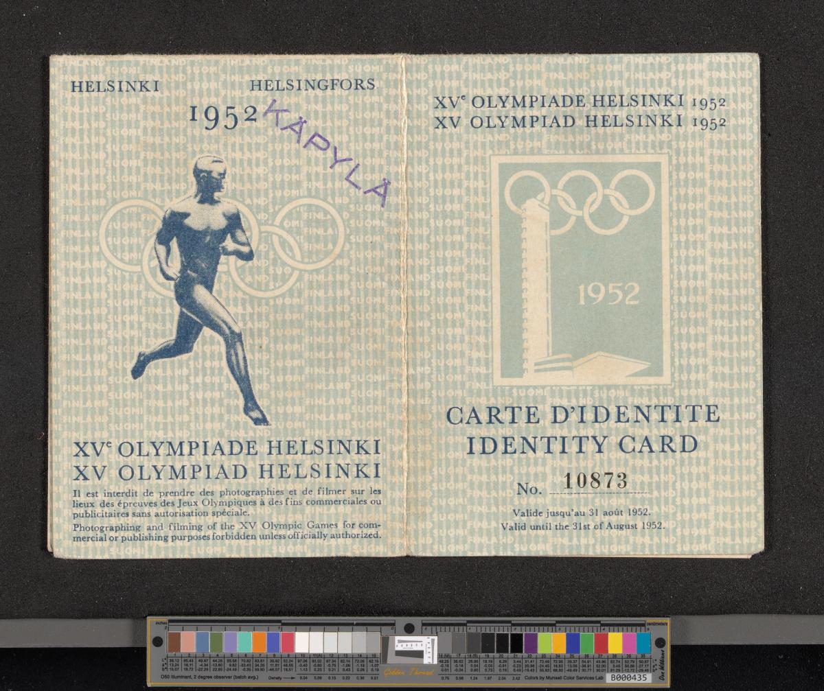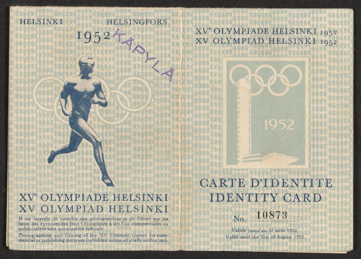 Identity card Nr. 10873. With the passepartout to the Honorary Stand. Emblem of the Games on the cover and Paavo Nurmi running in front of the Olympic rings on the back.