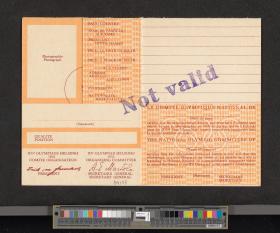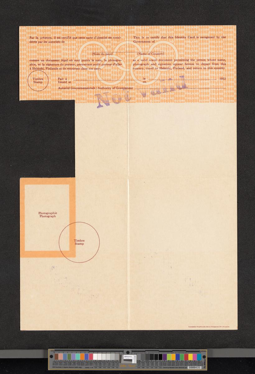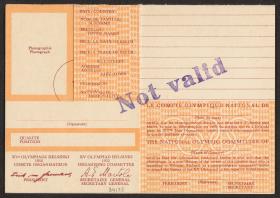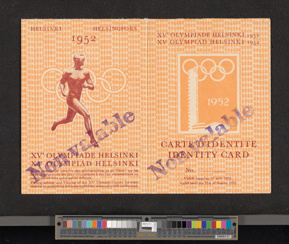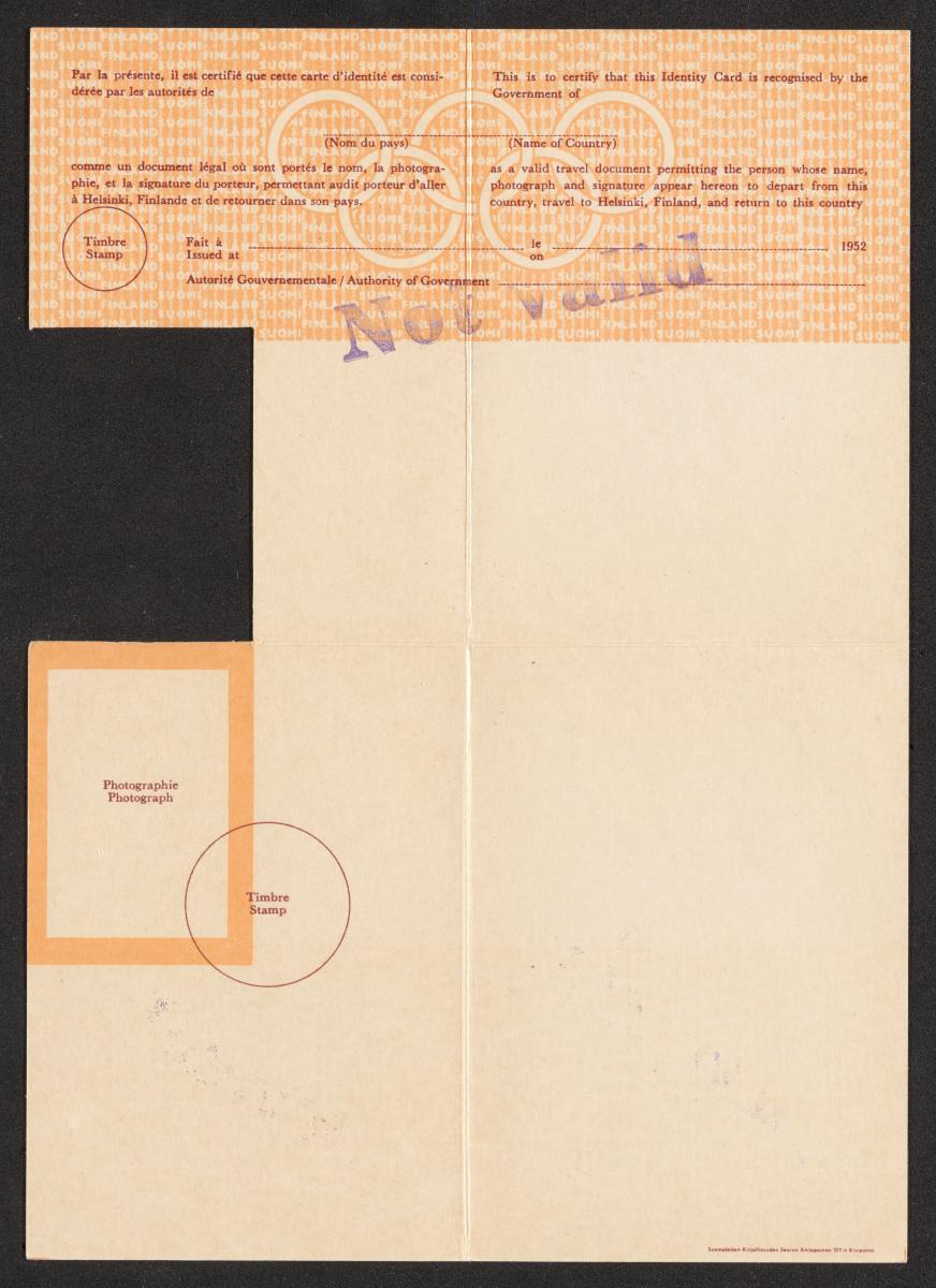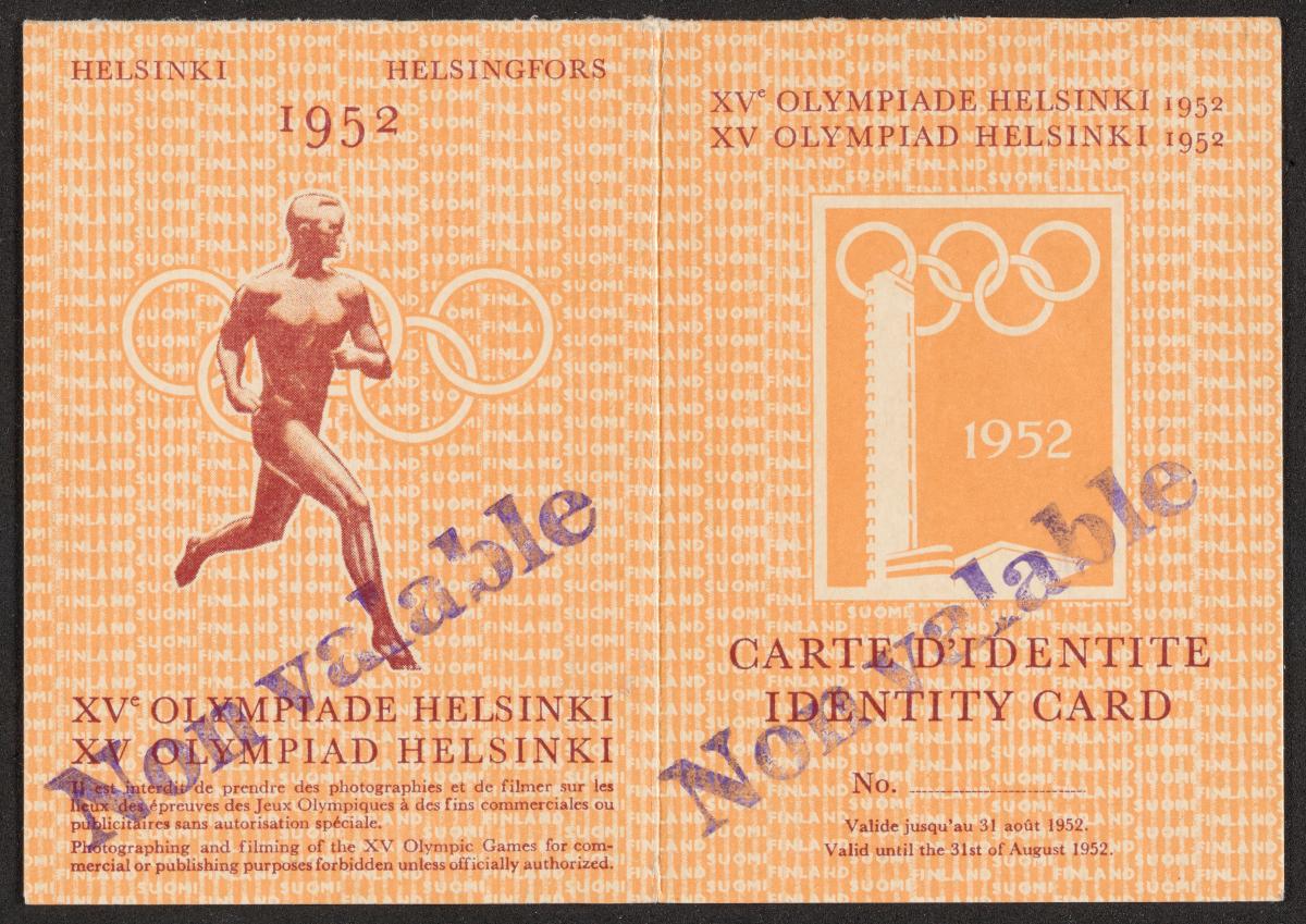 Blank identity card with the emblem of the Games on the cover and Paavo Nurmi running in front of the Olympic rings on the back. "Non valable" stamp.