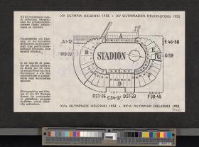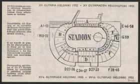 Pattern of the poster with Paavo Nurmi running with the olympic rings on the background. Map of the stadium on the back. Non valable stamp.