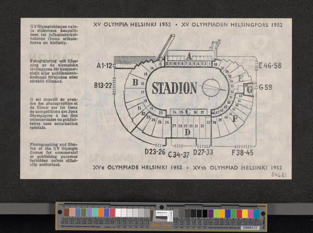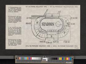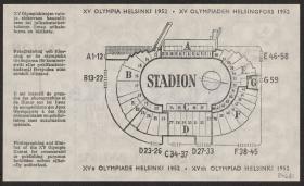 Pattern of the poster with Paavo Nurmi running with the olympic rings on the background. Map of the stadium on the back. Non valable stamp.
