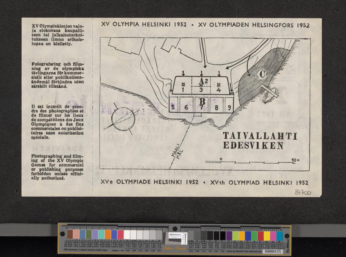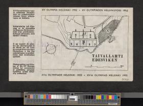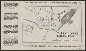 Pattern of the poster with Paavo Nurmi running with the olympic rings on the background. Map of the site on the back. Non valable stamp.