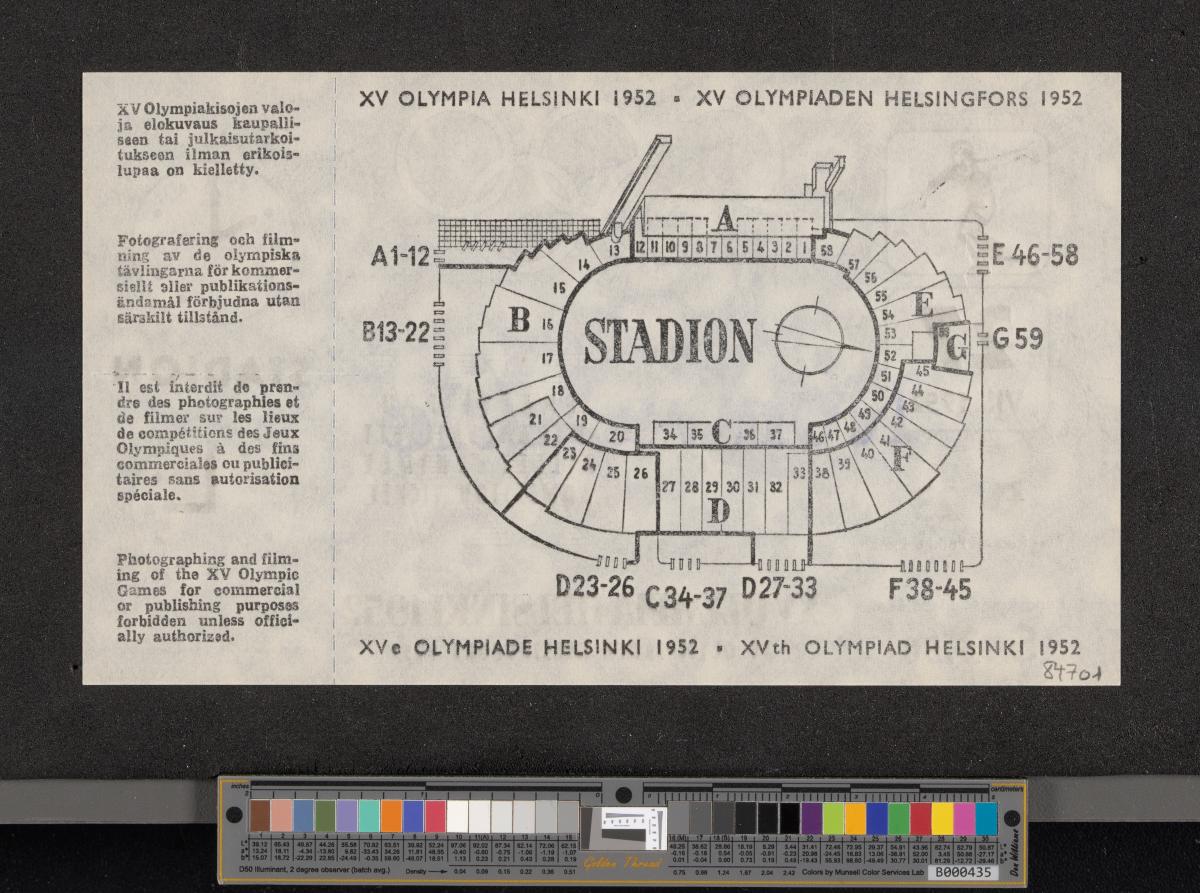 Pattern of the poster with Paavo Nurmi running with the olympic rings on the background. Map of the stadium on the back. Non valable stamp.