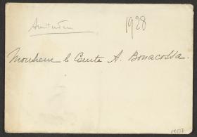 Invitation with the coat of arms of the city. Caption: “La Municipalité d’Amsterdam a l’honneur d’inviter / M. Comte Bonacossa / au diner, qu’elle se propose d’offrir à l’occasion de l’ouverture des / Jeux Olympiques, samedi le 28 juillet 1928, à 18.45 heures, / -Koningszaal-, Jardin Zoologique, Plantage Middenlaan. / AMSTERDAM, LE 19 JUILLET 1928. / Habit et décorations. / P. R. F. au Dr. S. J. VAN LIER / STADHUIS, AMSTERDAM (C.) / Après le dîner on ira en automobiles au Vieux Stade pour assister au Jeu Ichnaton".