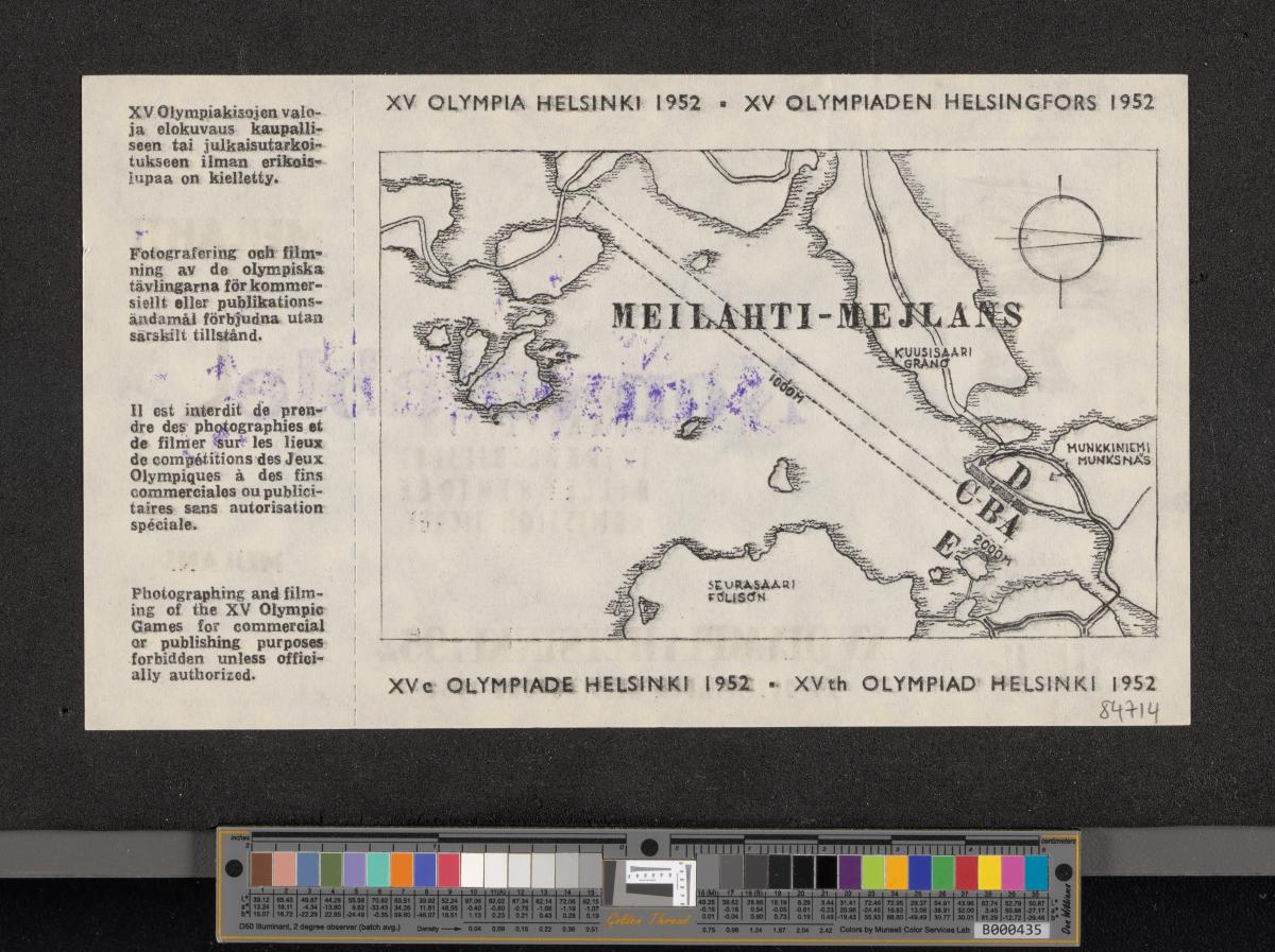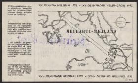 Pattern of the poster with Paavo Nurmi running with the olympic rings on the background. Map of the site on the back. Non valable stamp.