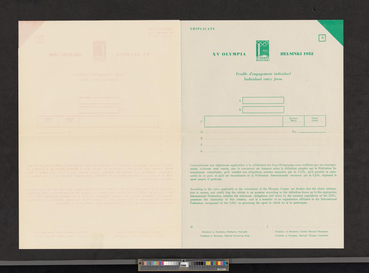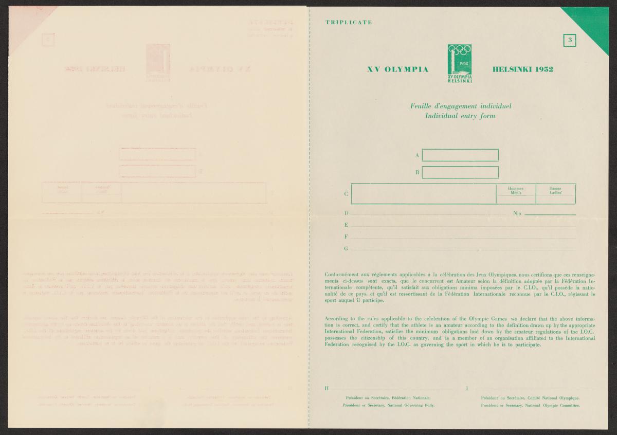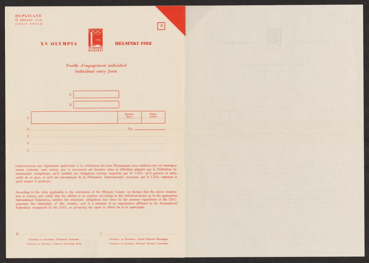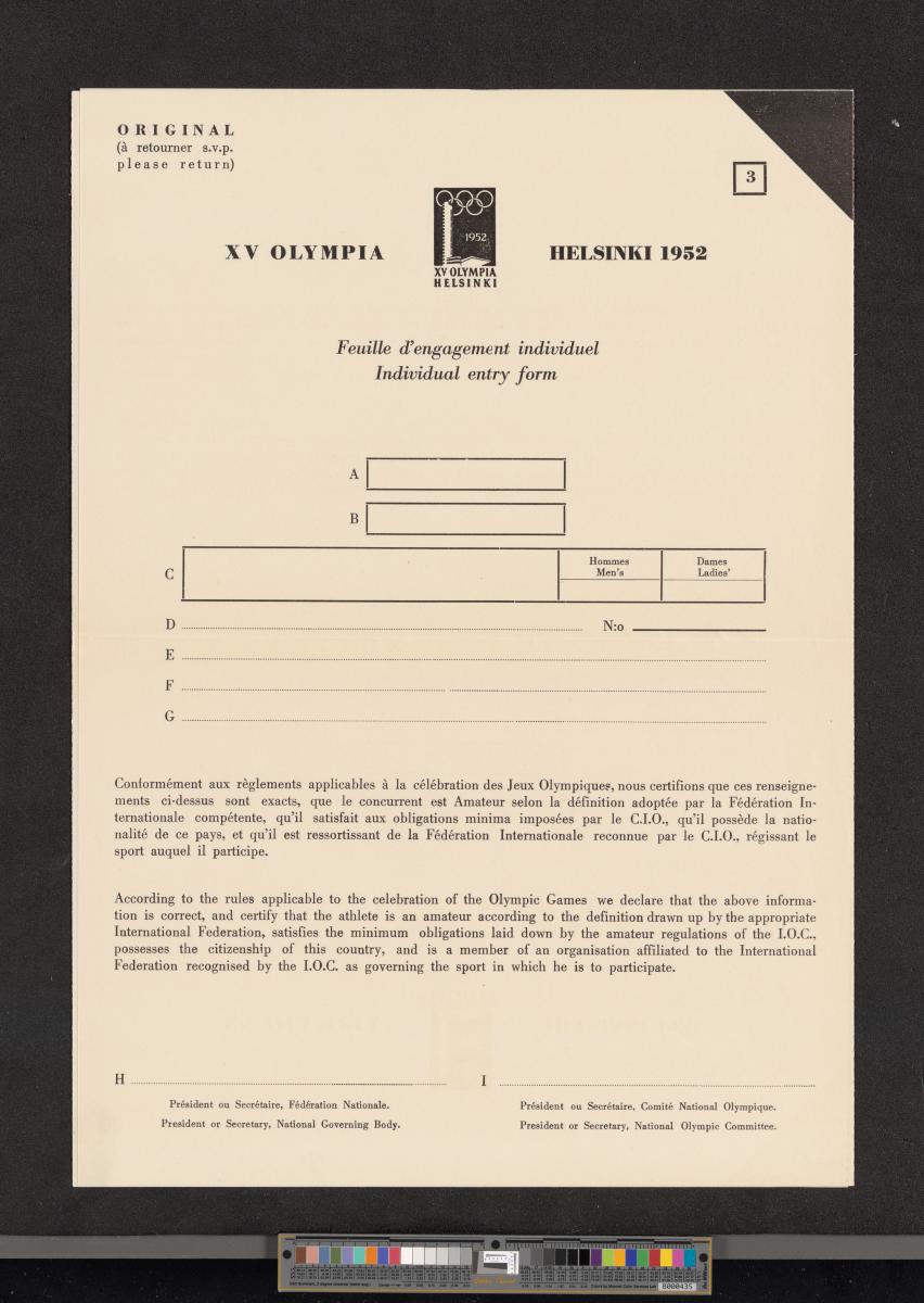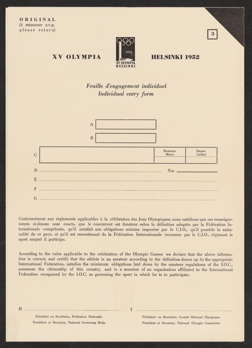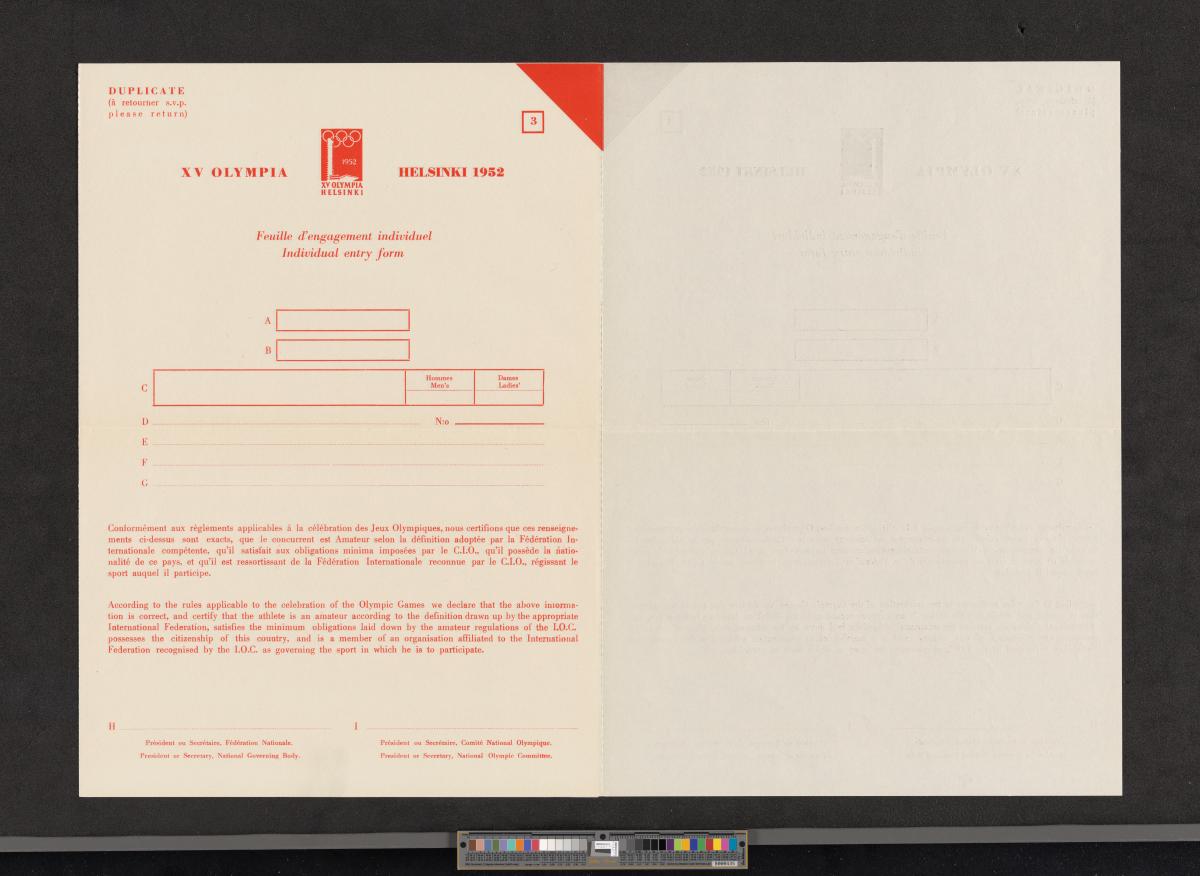 Registration form in triplicate of athletes with compliance practices in particular that rules regarding amateurism. Games' emblem.
