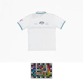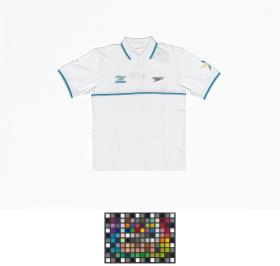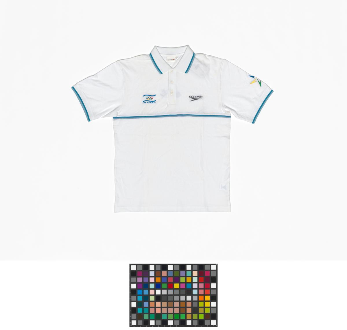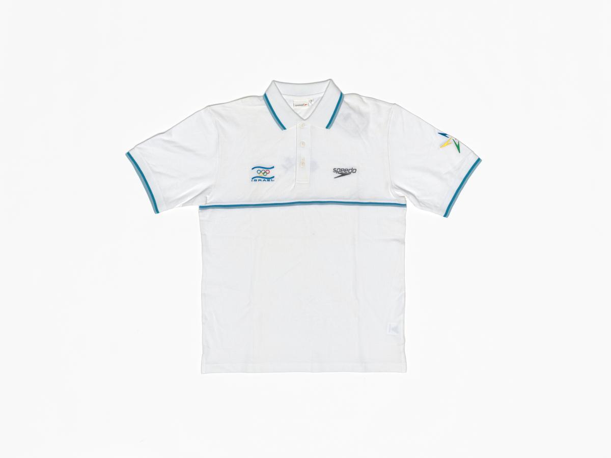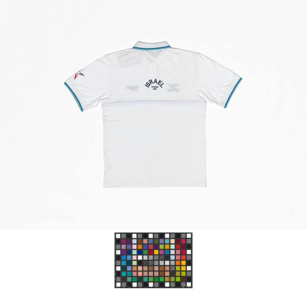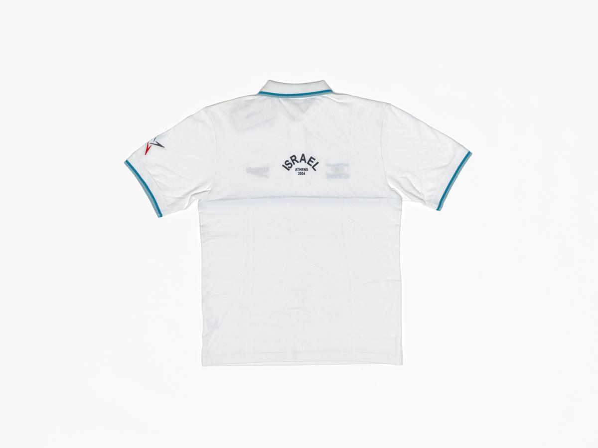 Blue edged white shirt with Israel NOC's emblem on the front. Onthe back there is the caption: "Israel / Athens / 2004". Size L.