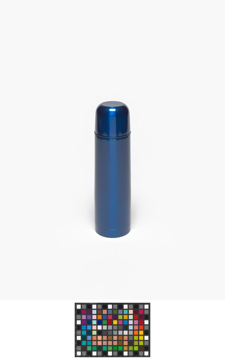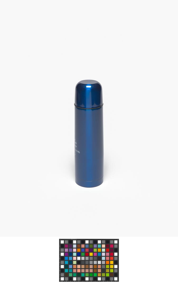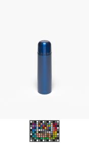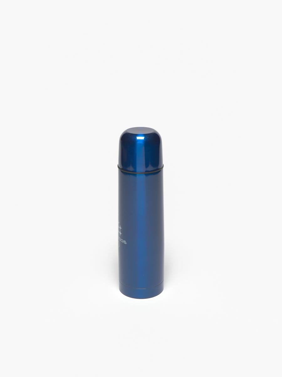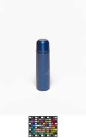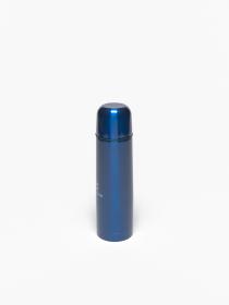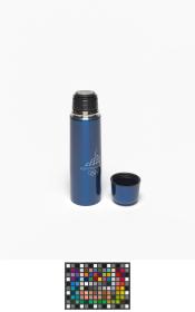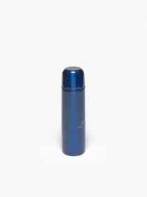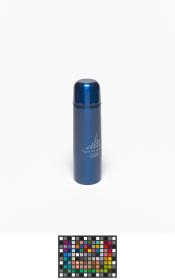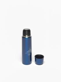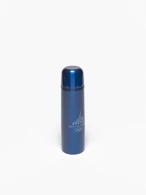 Blue thermos with an one-touch stopper in a carton following the graphic line of the Games and holding a hologramme.