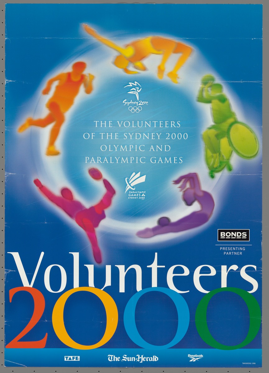 The computer graphics images of the poster are from very popular sports, athletics, football, gymnastics and wheelchair basketball. Caption: "The Volunteers of the Sydney 2000 Olympic and Paralympic Games. Volunteers 2000. Bonds presenting partner. TAFE. The Sun Herald. Reebok".