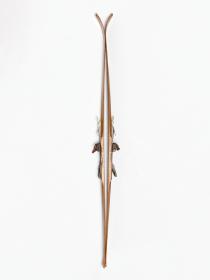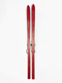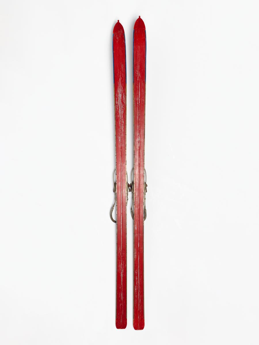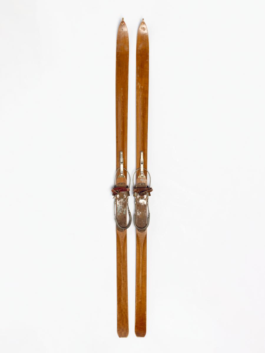 Wooden skis with the label "H. Mages Sport, Villars-Ollon". Metal edges. Kandahar bindings with spring and cable. Symbol with an arrow (or an airplane?). Trademark: Staub Tödi (sole). Red coating or painting on the base. Metal edges.