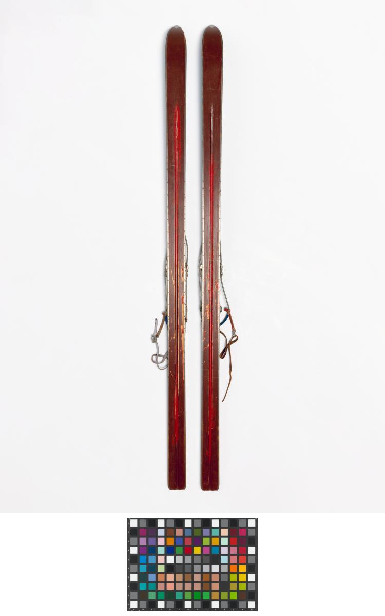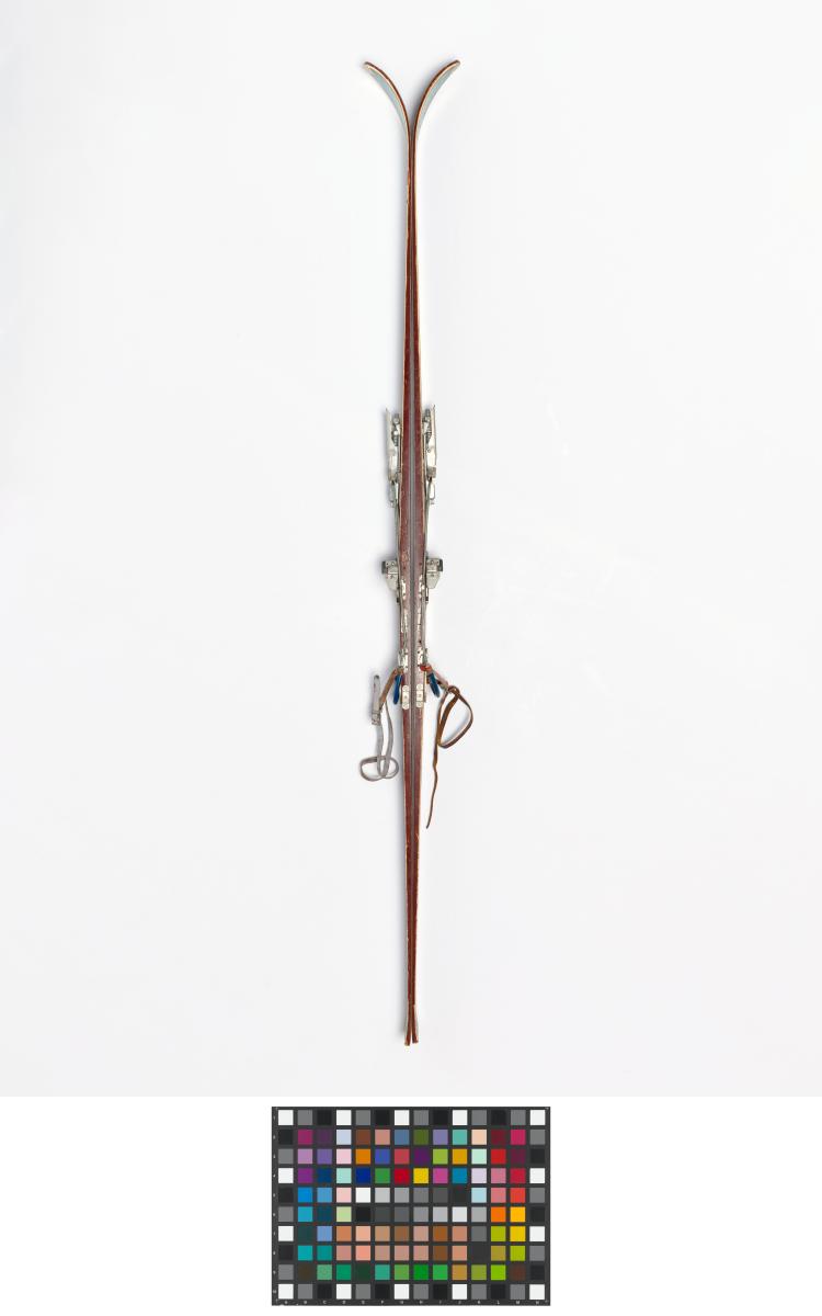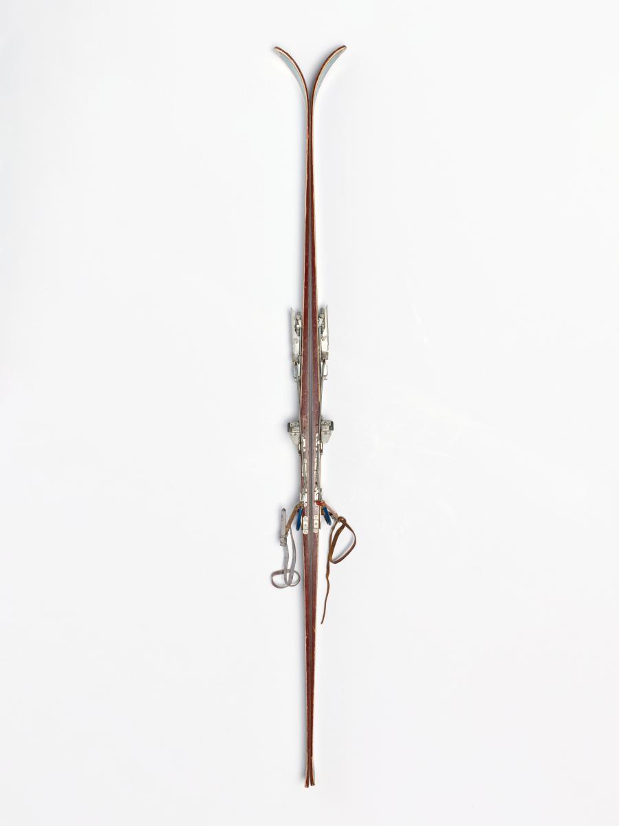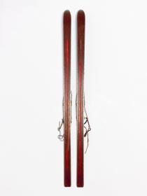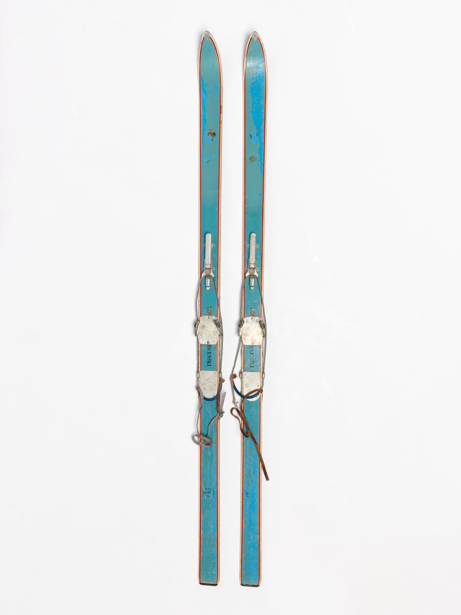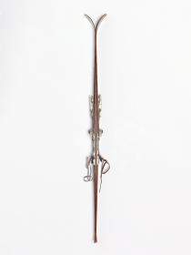 Wooden skis with metal edges, model "Rover" (?), with erased/cut inscriptions on decals "Pis" et "rkenski". Attenhofer Flex bindings with spring and cable. Decal of a coat of arms with the name Vaucher (probably the reseller).